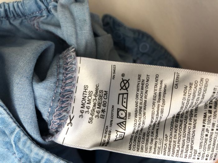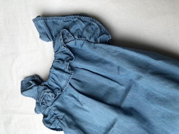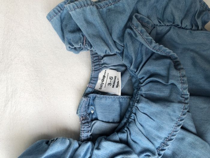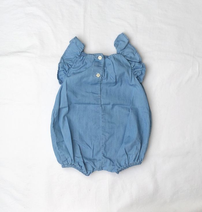 Barboteuse / combishort été baby Gap, Taille 3-6 mois/ 58-69 cm, 100% coton. En jean bleu, très fin. Volants sur les épaules et l’encolure. Ouverture par boutons en haut du dos et par pressions entre les jambes. En très bon état, sans trou ni tache. 🌸 Vous aimez cet article ? N’oubliez pas de visiter le reste de mon dressing en filtrant les tailles.