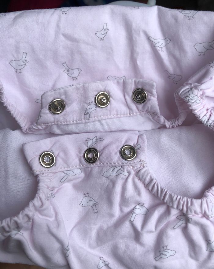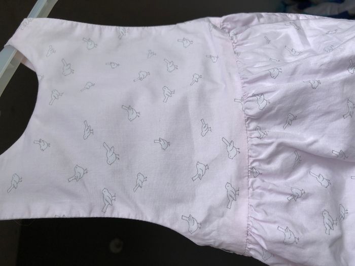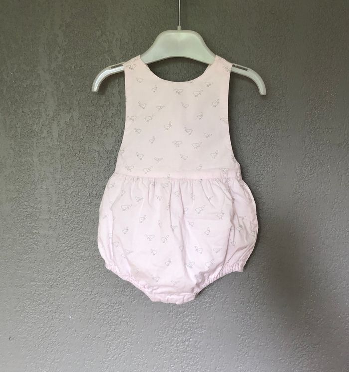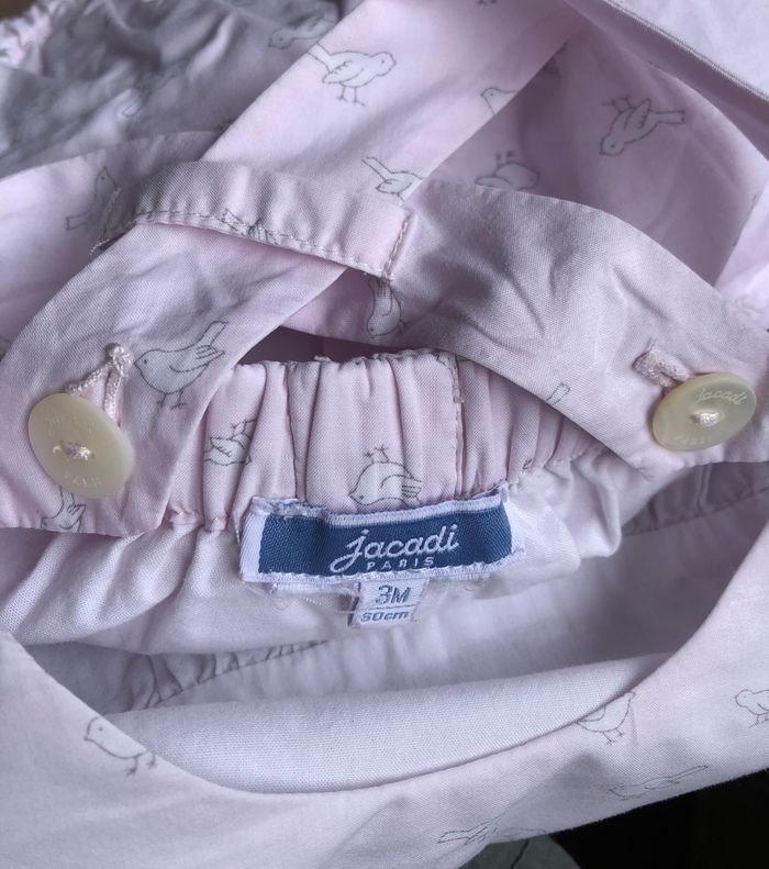 Combinaison short/ combinaison courte /salopette /barboteuse été Jacadi, Taille 3 mois/ 60 cm, Bretelles croisées dans le dos, Doublée. De couleur rose très pâle, motifs petits oiseaux blancs, Nœud matelassé dans le dos. Magnifique portée avec un body à col. Ouverture par pressions entre les jambes, les bretelles s’attachent avec des boutons en nacre. Comme neuve, pas de signe d’utilisation. 🌸 Vous aimez cet article ? N’oubliez pas de visiter le reste de mon dressing en filtrant les tailles.