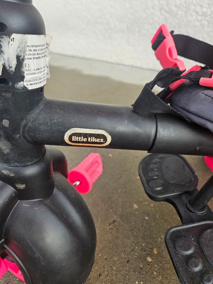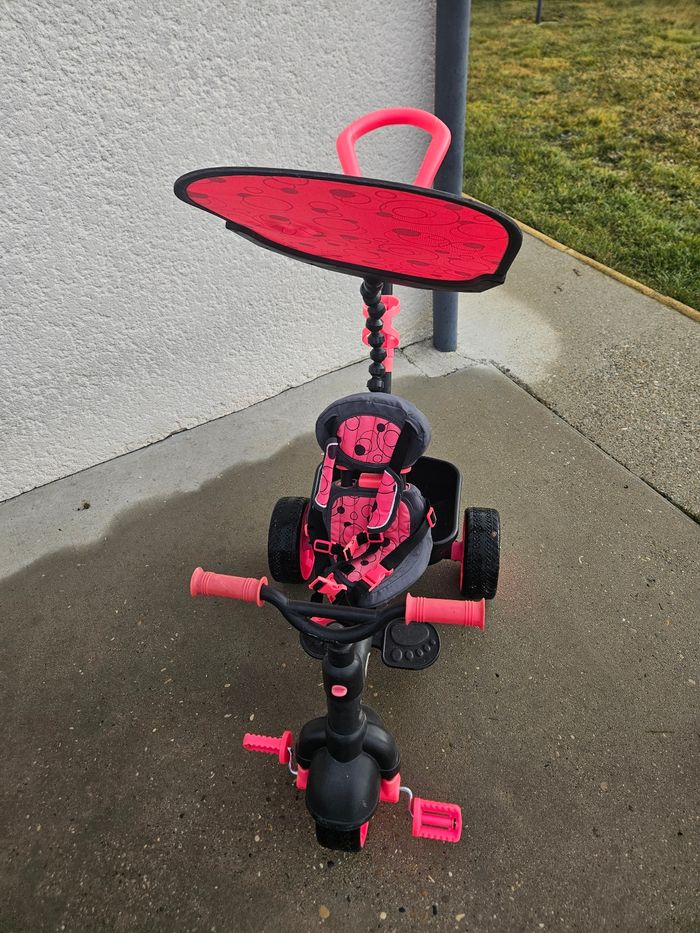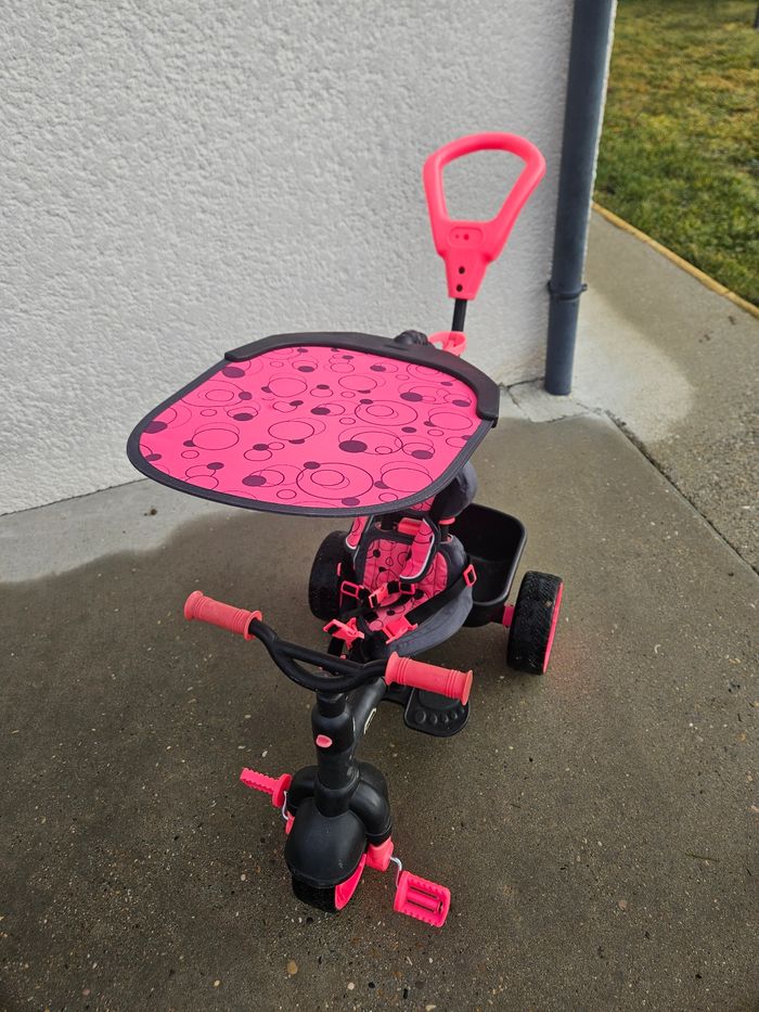 Vends tricycle enfant en très bon état, idéal pour les balades en toute sécurité, avec ceintures de sécurité. La roue avant tourne avec la poignée. Tricycle stable à 3 roues Poignée parentale pour guider l’enfant pare-soleil amovible Siège confortable avec harnais de sécurité Repose-pieds pour les plus petits Petit panier arrière pour transporter des jouets Couleur rose et noir, motifs ludiques Tricycle propre et fonctionnel.