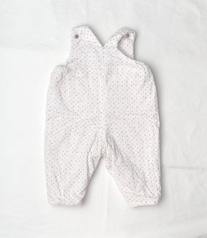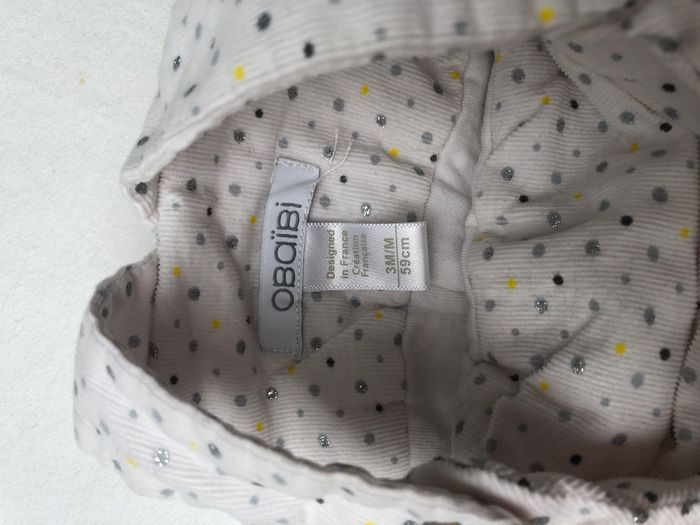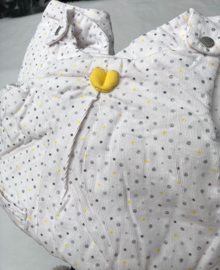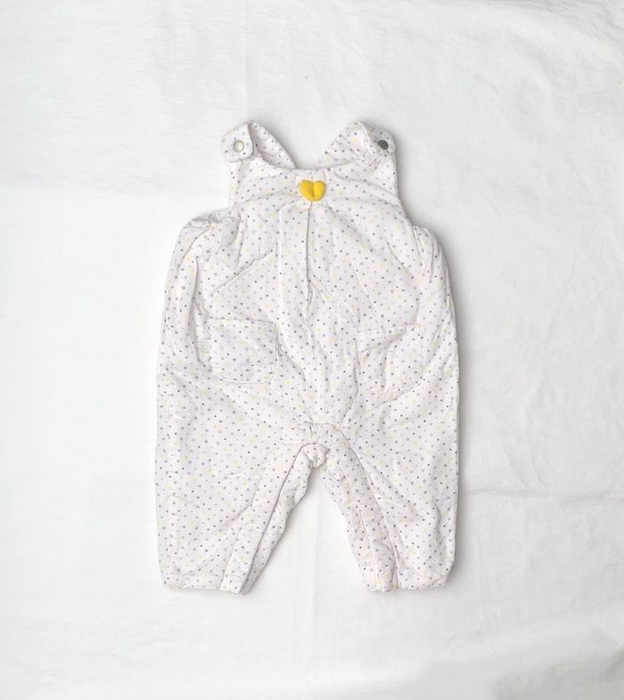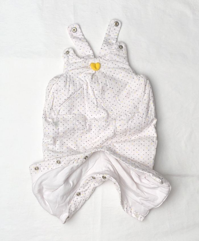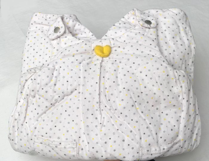 Combinaison longue Obaïbi, Taille 3 mois /59 cm, Bien chaude et confortable pour l’hiver : intérieur en jersey de coton, extérieur en velours côtelé et matelassée entre les deux tissus. Blanche avec des petits points gris, en paillettes argentées et jaunes. Ouverture par pressions au niveau des bretelles et entre les jambes. En très bon état, sans trou ni tache. Blanc non grisé. 🌸 Vous aimez cet article ? N’oubliez pas de visiter le reste de mon dressing en filtrant les tailles.