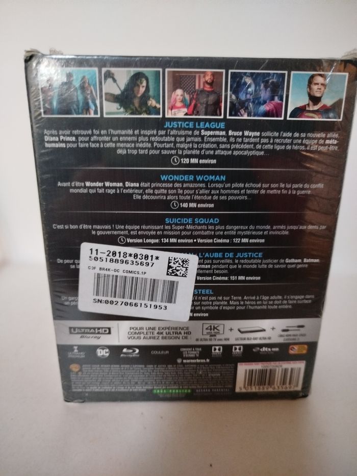 📀 4K ℹ️ Coffret sous blister 🇫🇷 avec VF ✅ Coin abîmé (photos) 💎 Justice League + Wonder Woman + Suicide squad + Batman vs Superman + Man of Steel 🎞 Super Heros 🎭 avec Margot Robbie, Ben Affleck, Gal Gadot, Henry Cavill, Jason Momoa..... N'hésitez pas à consulter mes autres articles pour faire des lots ! 4K, Blu ray, film, movie, DC , DC comics, super héros, Batman, Superman, Justice league, Wonder woman, Aquaman, Flash, collection, Geek Street...