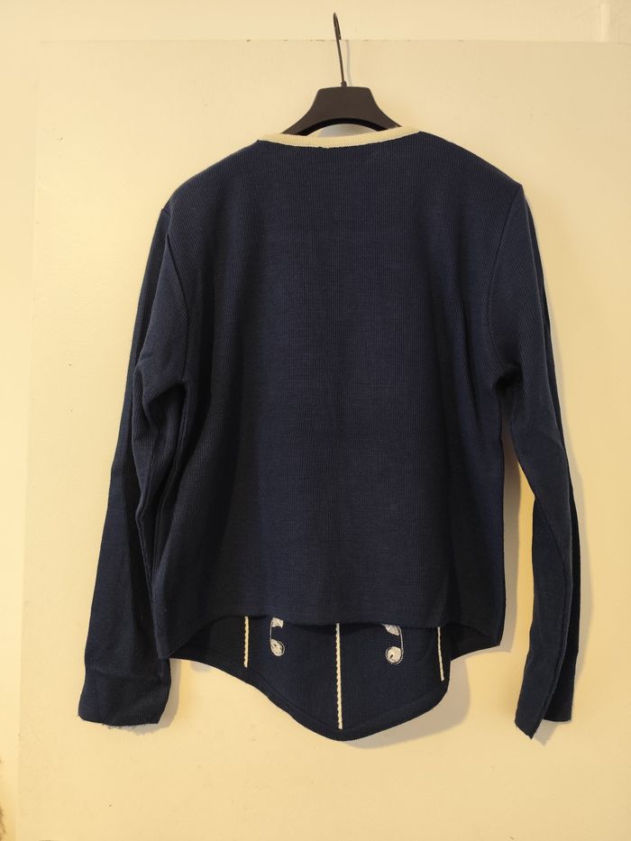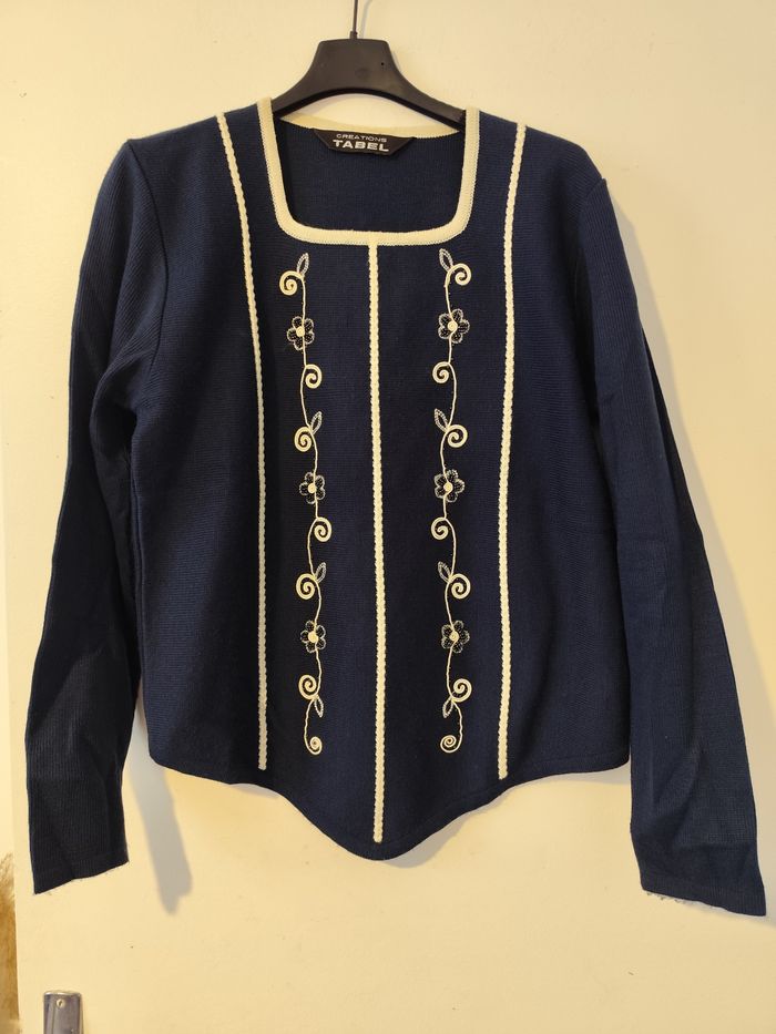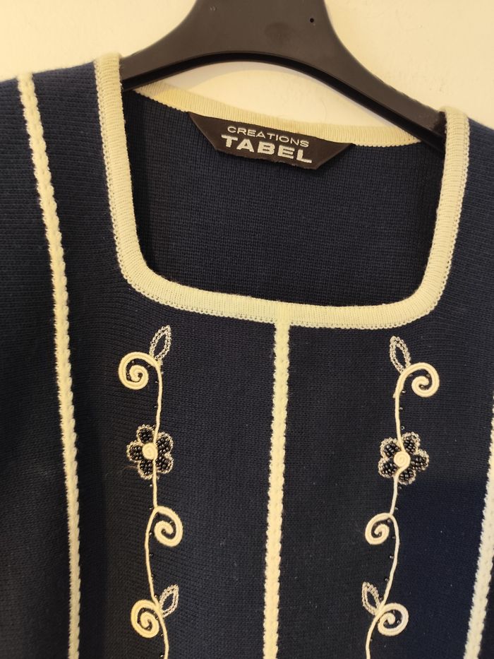 Pull bleu marine et beige à fleurs. Col carré Coupe originale Taille 40 Vintage
