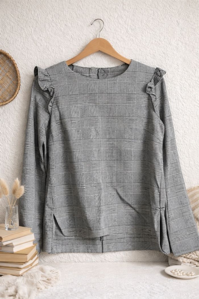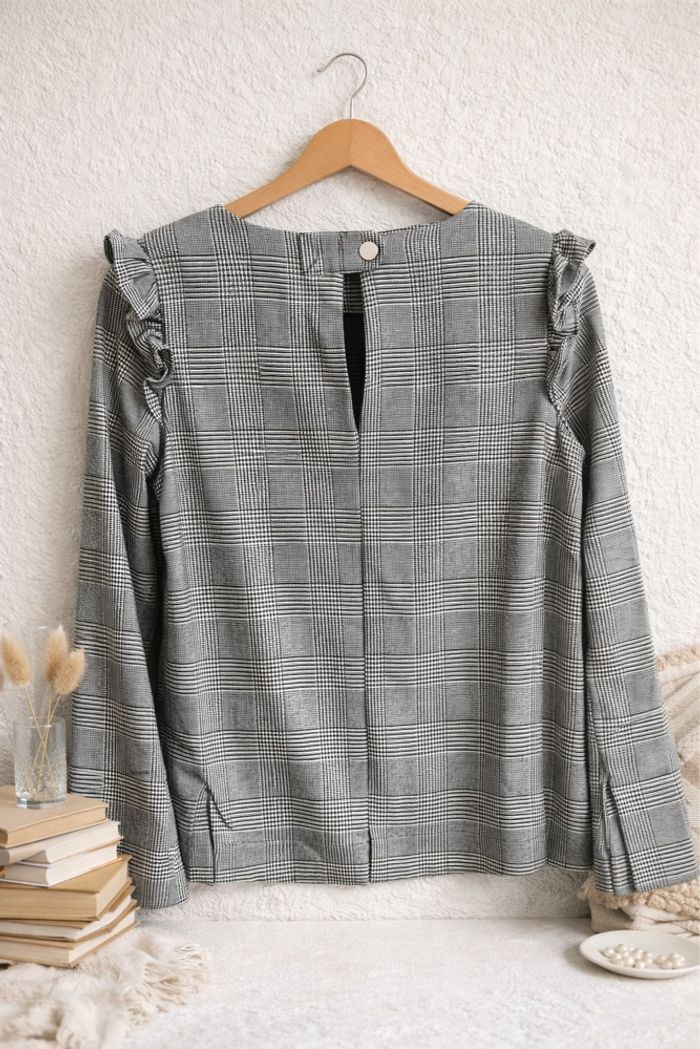 Blouse femme en très bon état taille 34 de couleur grise et noire à carreaux. Marque Mango