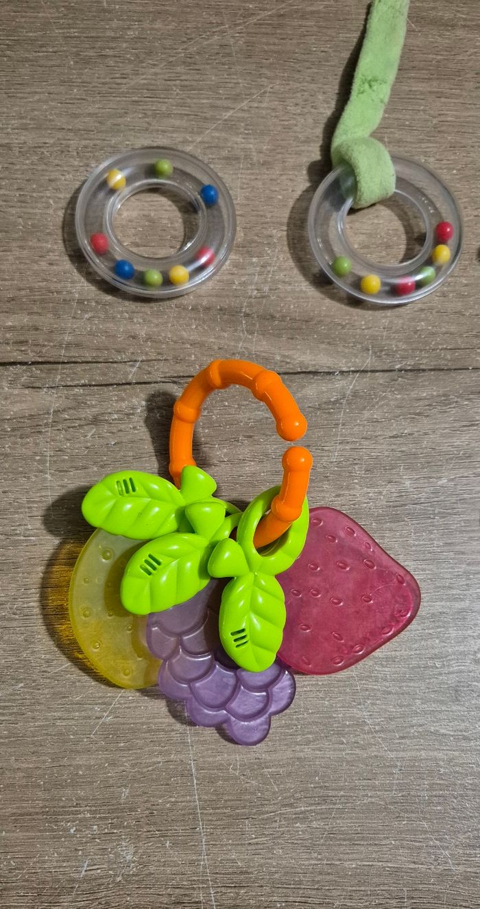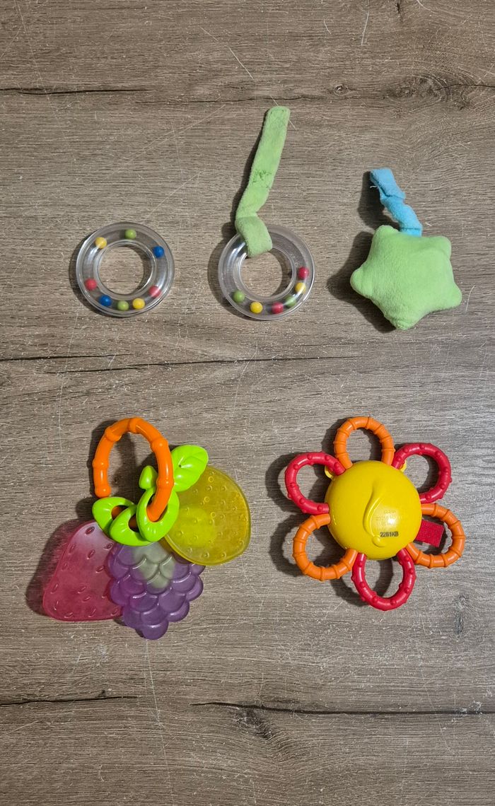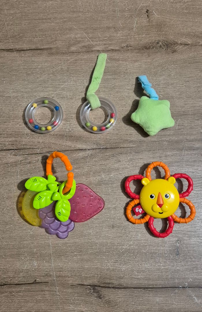 Lot de 2 hochets de dentition et 3 hochet (2 peuvent se suspendre) Très bon état