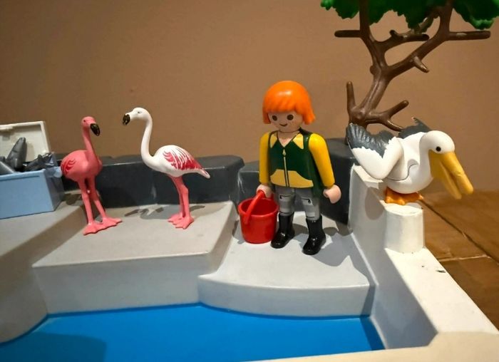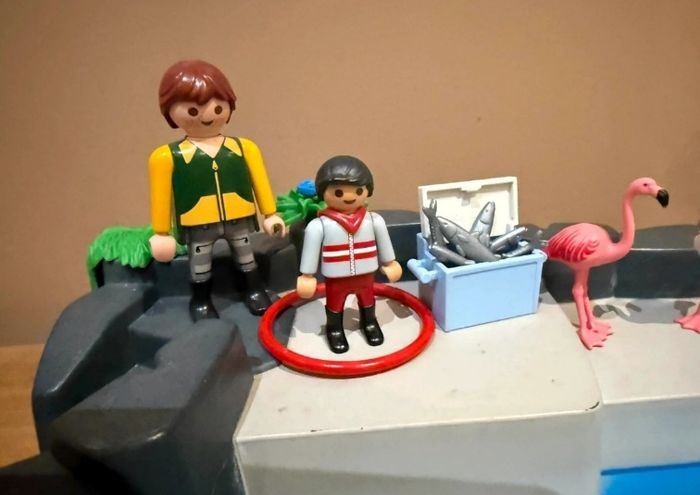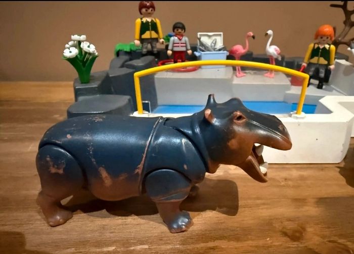 Playmobil set 3135 Zoo Superset Bassin phoques Set modifié et en très bon état avec uniquement la plaque issu du set 3135 Lot composé de 2 hippopotames, 2 flamants roses 1 oiseau et 3 personnages À vendre ce qui se trouve sur les photos