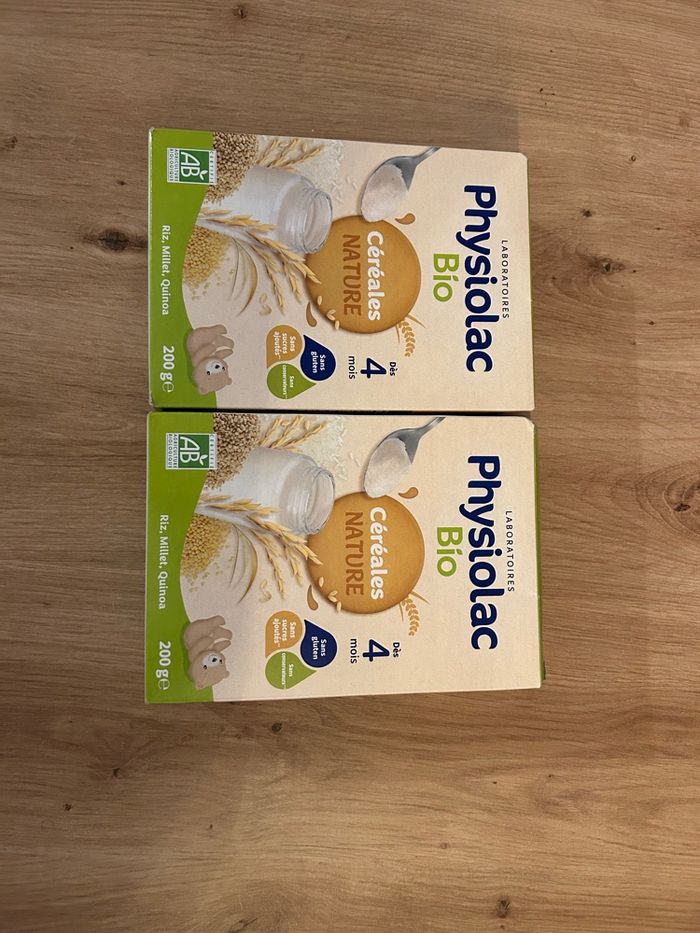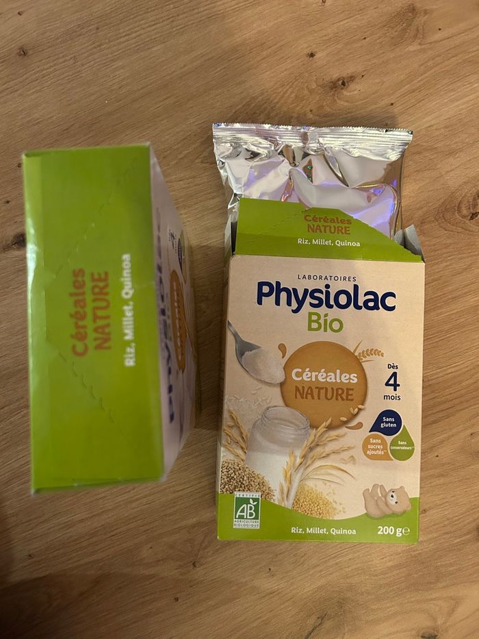 Vends 2 boites de céréales nature Physiolac Bio, date de péremption en 01/2027. 1 boîtes qui est ouverte mais sachet intacte.