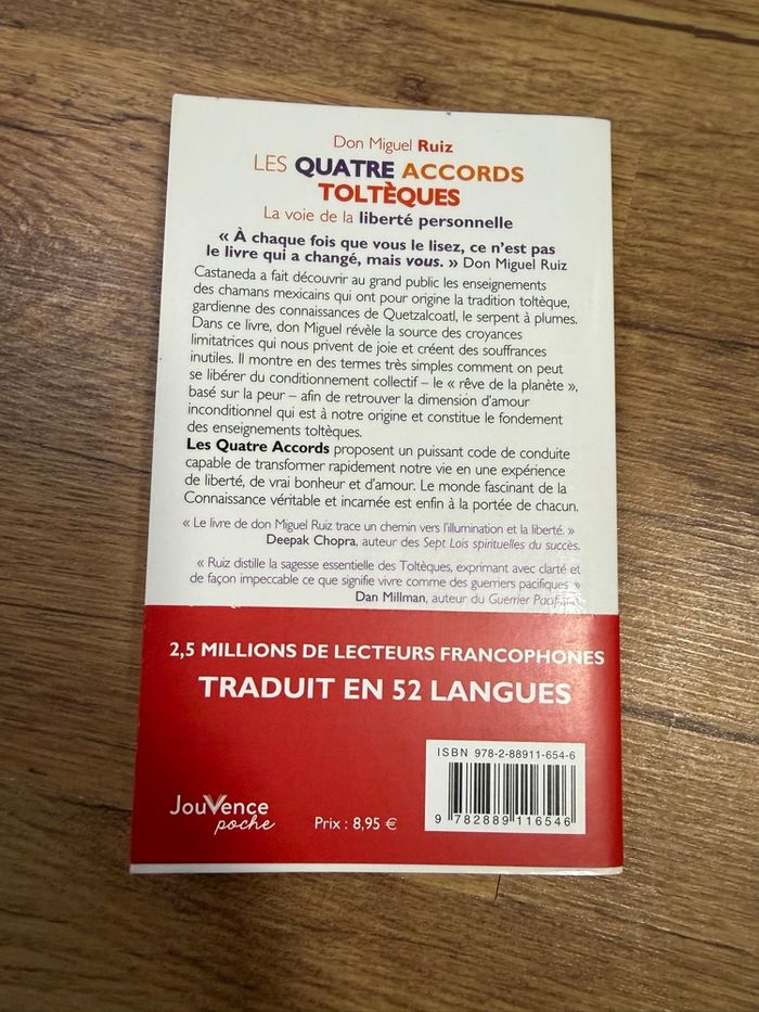 ✨ Les Quatre Accords Toltèques – Don Miguel Ruiz 📘 Édition Jouvence poche Un livre incontournable de développement personnel, simple, profond et intemporel 🌿 👉 Idéal pour mieux se comprendre, gagner en sérénité et avancer vers plus de liberté intérieure. 📌 État : très bon • Pages propres, non cornées • Couverture protégée avec un protège-livre collant transparent posé par mes soins • Livre soigné, prêt à être lu 📖 💡 Pourquoi le lire ? ✔️ Le livre de sagesse le plus lu dans le monde ✔️ Accessible à tous ✔️ À lire et relire, chaque lecture apporte quelque chose de nouveau 📦 Envoi rapide et soigné 📩 N’hésite pas si tu as des questions ✨ À saisir !