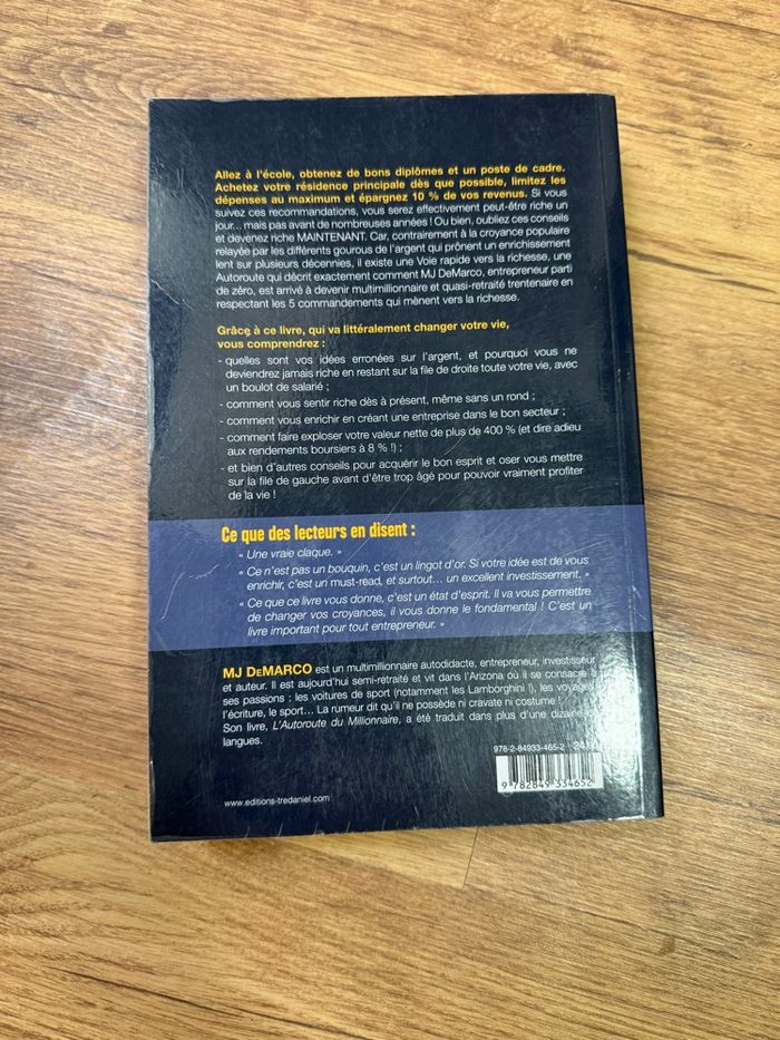 📘 L’Autoroute du Millionnaire – MJ DeMarco 💸 La voie express vers la richesse Livre de développement personnel / finances personnelles, très recherché. ✨ État : très bon • Livre protégé avec un film transparent collant • Pages propres, aucune annotation ni surlignage • Dos et tranches en très bon état 📖 Résumé rapide : Dans L’Autoroute du Millionnaire, MJ DeMarco démonte les idées reçues sur l’argent et explique pourquoi le schéma classique (études, CDI, épargne lente) mène rarement à la liberté financière. Un livre cash, motivant, orienté action, entrepreneuriat et indépendance financière. 📌 Idéal pour : • Changer son rapport à l’argent • Comprendre les erreurs financières courantes • Personnes attirées par l’entrepreneuriat et la liberté financière 📦 Envoi soigné et rapide