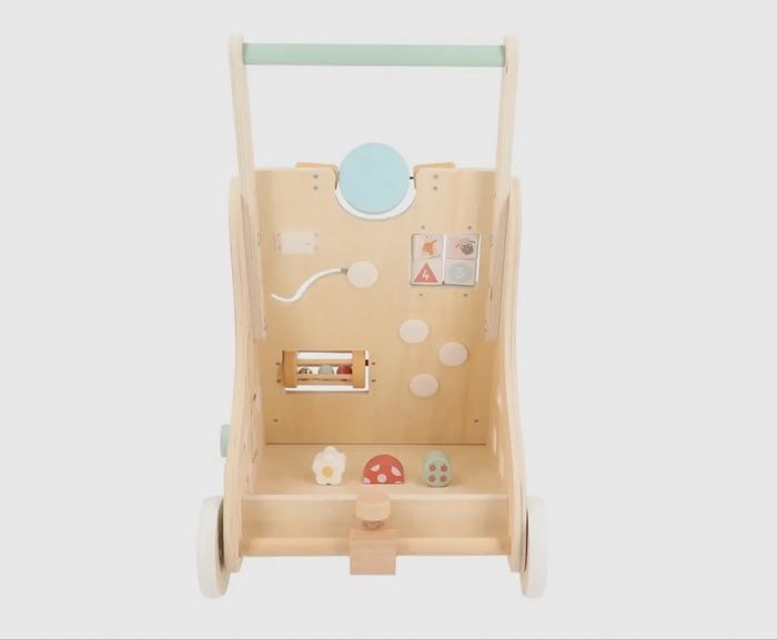 Il y a de nombreuses activités à explorer et à maitriser, telles que: engrenages rotatifs, pièces à emboîter, miroir, labyrinthe de formes et bien plus encore. Grâce à son design équilibré, le trotteur est très adapté pour apprendre à marcher pour les enfants de 12 mois ou plus qui sont presque prêts à faire leurs premiers pas. Les roues ne laisseront pas de marques sur le sol et sont sures pour une utilisation en intérieur. Matériau : bois de hétre, peinture a base d'eau Roues avec revêtement en plastique Tiroir arrière pour ranger et transporter les blocs de bois emboîtables inclus et vos jouets préféres Inclut 3 figures emboitables Dispose d'un frein manuel, qui réduit le mouvement pour les petits moins expérimentés Dimensions 55 x 33,5 x 32,5 cm