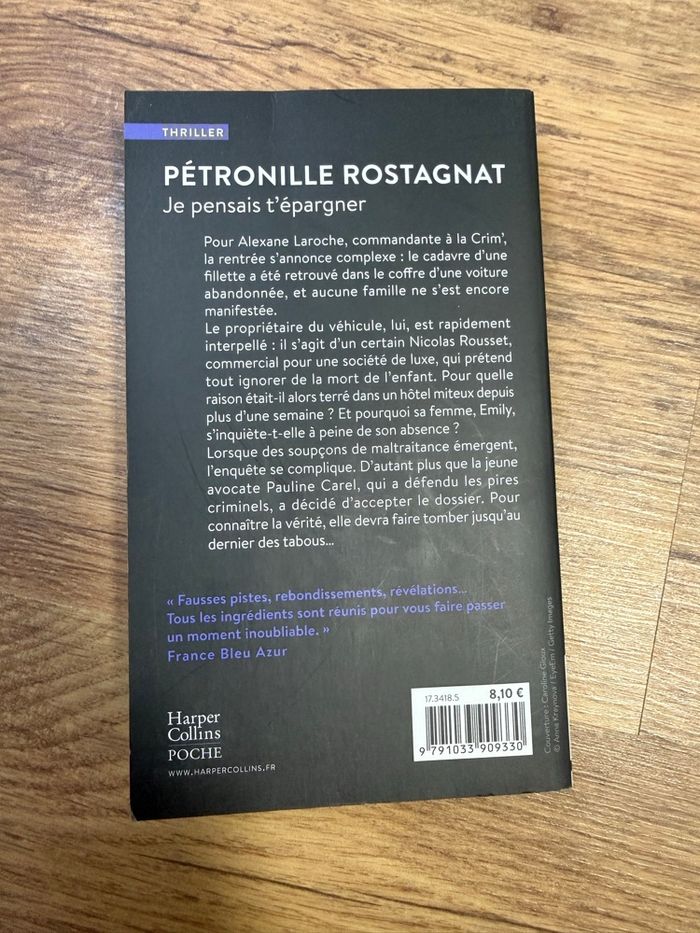 📖 Je pensais t’épargner ✍️ Pétronille Rostagnat Un thriller psychologique intense et glaçant, impossible à lâcher. Une enquête sombre, des rebondissements maîtrisés et une tension qui monte page après page… un vrai page-turner 🖤 ✨ État : très bon état • Pages propres, non cornées • Dos en bon état • Aucune annotation ni écriture • Livre bien conservé (voir photos) 📚 Édition poche – HarperCollins 📦 Envoi rapide et soigné 👉 Parfait pour les amateurs de thrillers français, enquêtes psychologiques et suspense haletant. 💬 N’hésite pas si tu veux un lot livres ou d’autres titres du même genre !