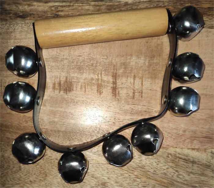 Instrument de musique 🎵 Poignée Grelots 🎵 Grelots x9 en métal de 2,5 cm de diamètre Poignée bois de 9 cm de largeur Lanière plastique Objet d'occasion vendu tel que présenté sur photos .