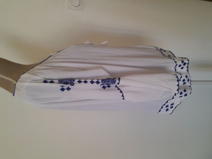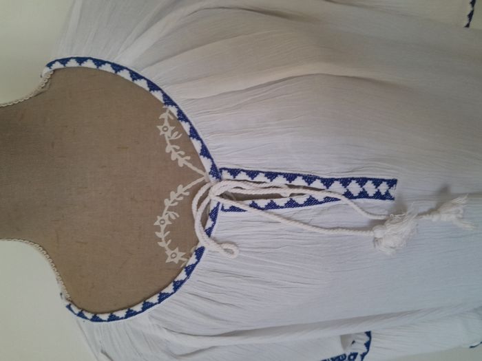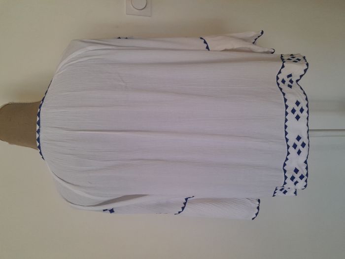 Tunique, manche 3/4, col tunisien, attache cordon devant Longueur : 60cm Aiss / Aiss : 68cm Matière : 100 % Viscose Marque : Gémo