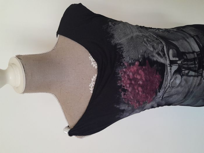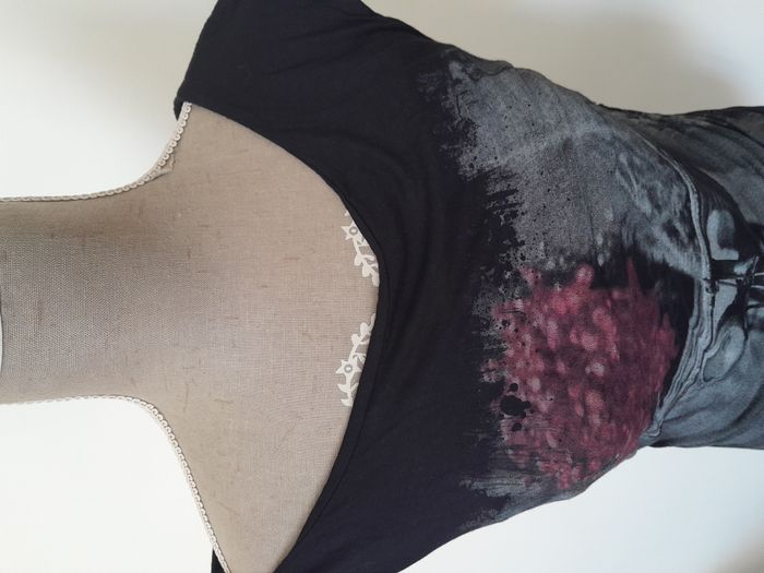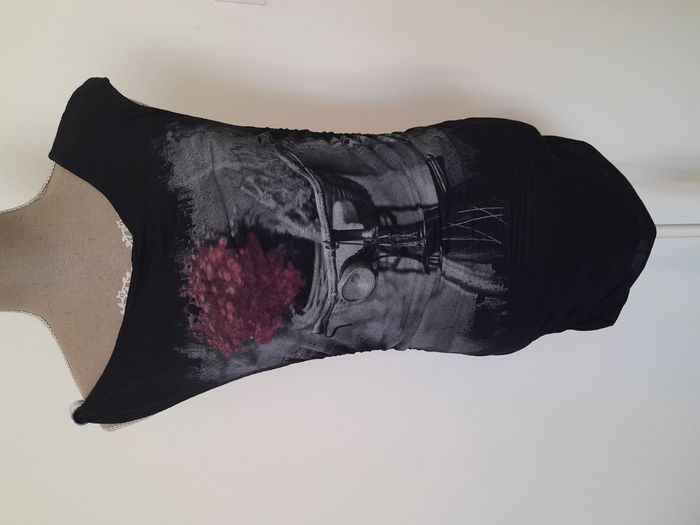 Tunique, sans manche, imprimé rétro, bijoux sur 1 épaule, fronce sur les côté Longueur : 74cm Aiss / Aiss : 42cm Matière : 95 % Viscose, 5 % Elasthanne Marque : Inspee