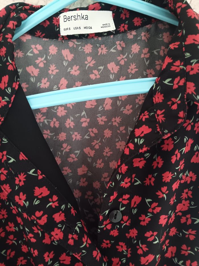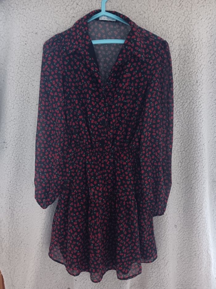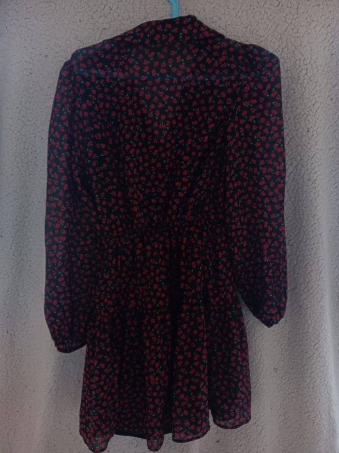 Robe courte à manches longues Jupe doublée Noire fleurie rouge Taille élastique Taille S