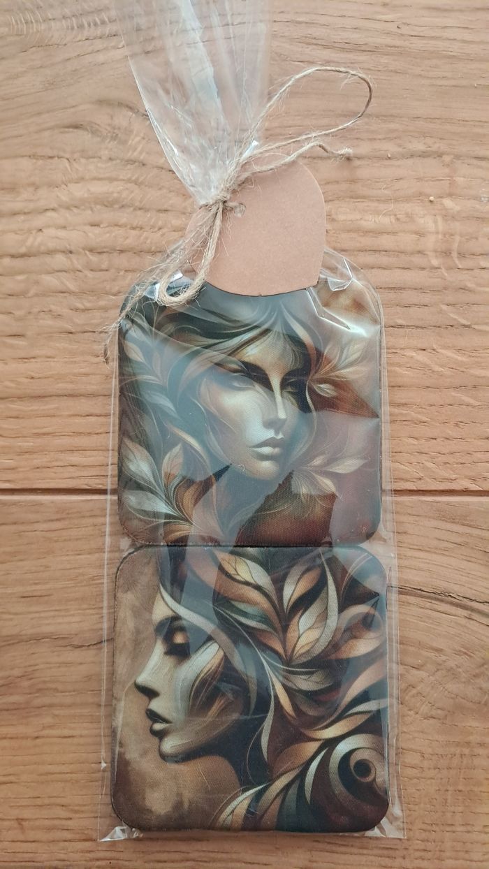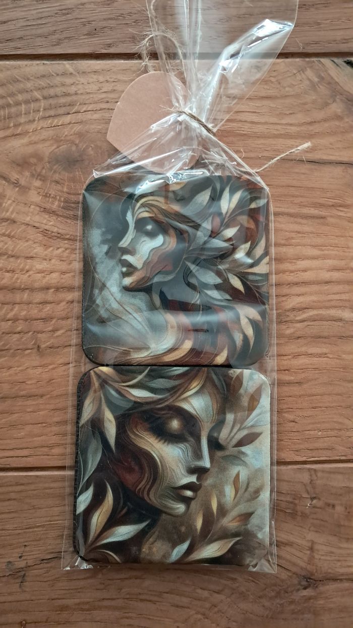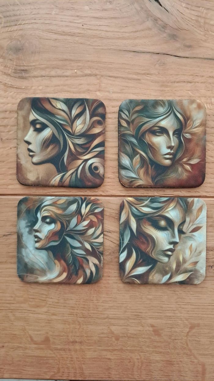 Lot de 4 dessous de verre visage femme Dessous en caoutchouc et surface en tissu Dimensions 9x9 Nuances de marron beige kaki Sous blister