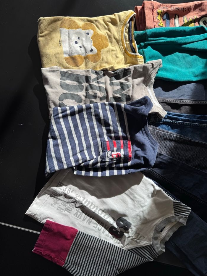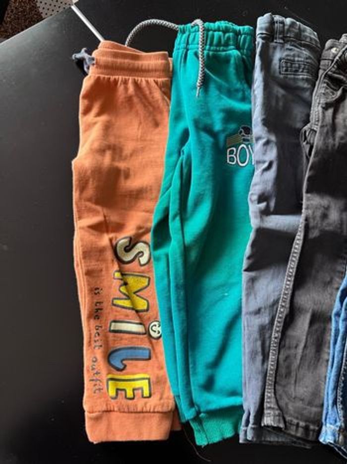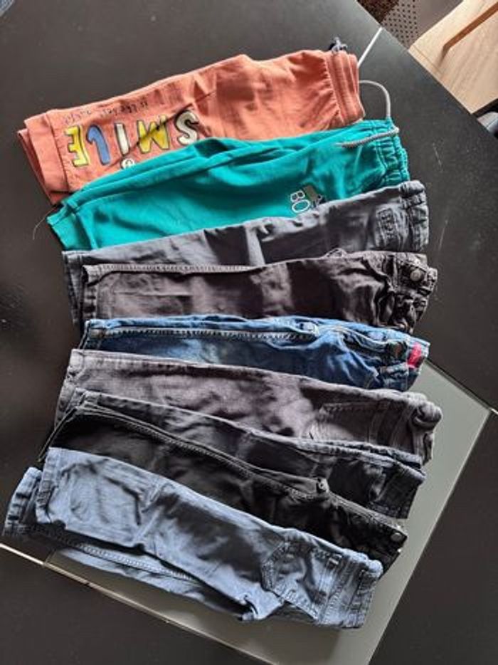 2 pantalons coton (1 avec petit trous) 6 pantalons jeans en très bon état 1 jean usé au niveau des genoux et derrière 4 t-shirt manches longues