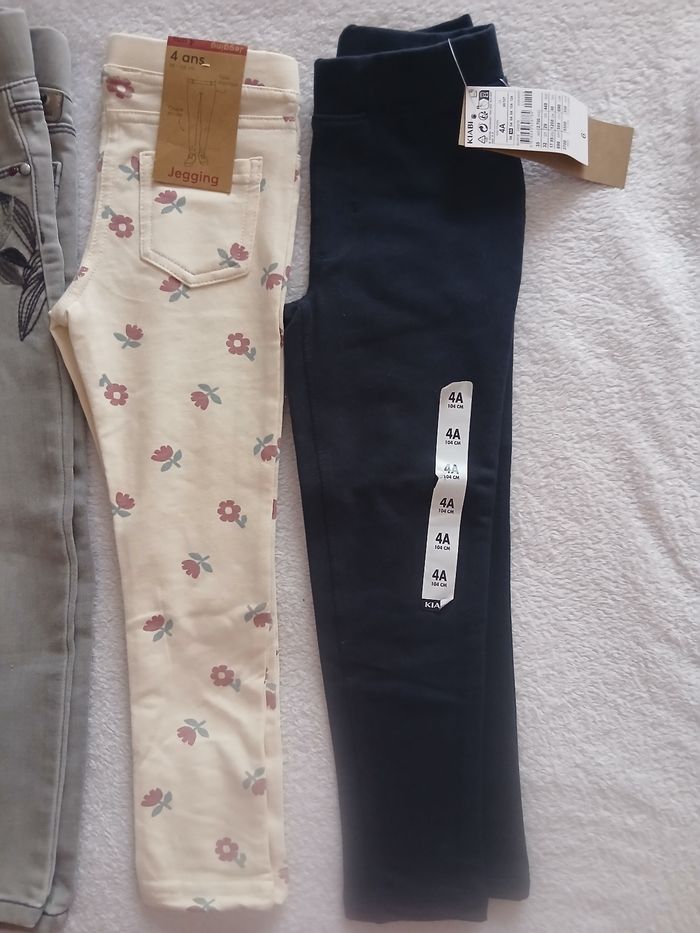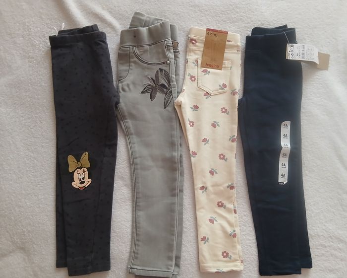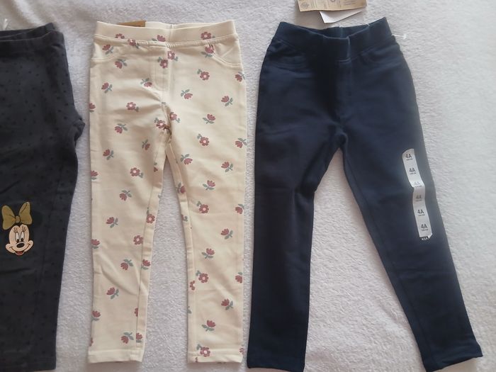Lot comprenant : 2 jeggings neufs kiabi et fpc 1 jean Catimini taille 3 ans mais taille grand 1 legging Minnie taille 6 ans mais taille petit
