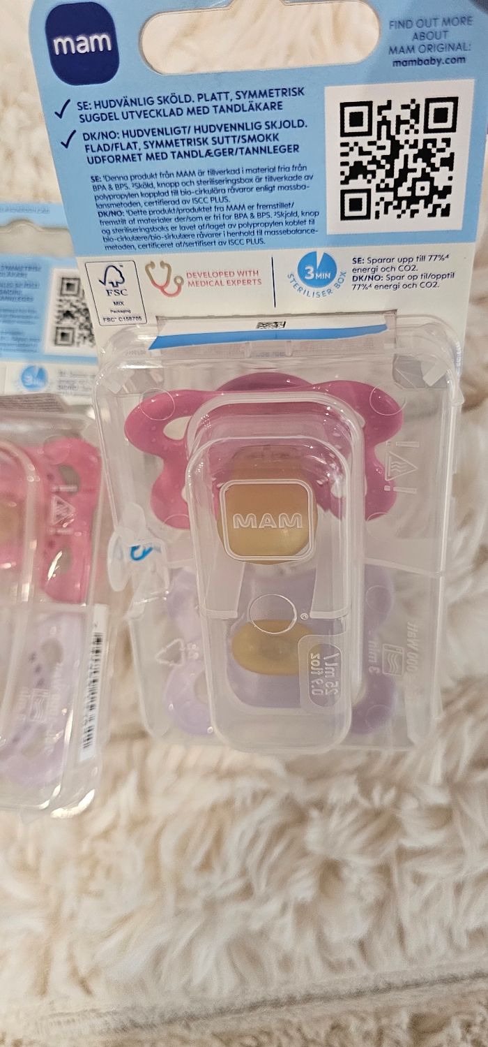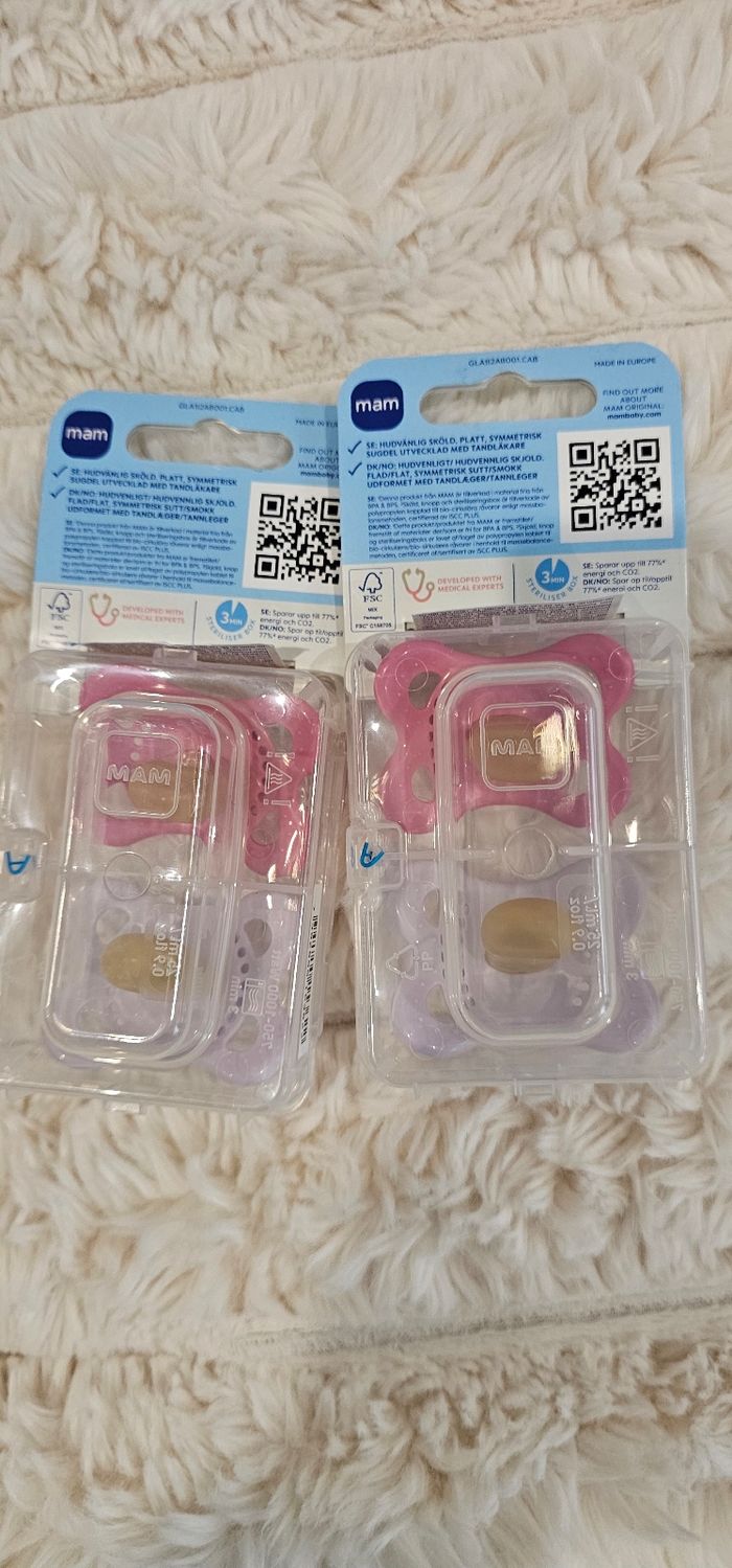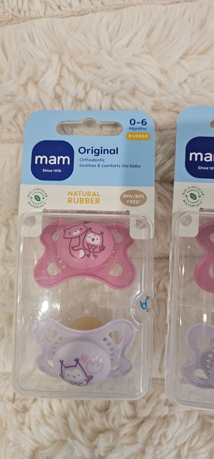 Lot de 4 sucettes 🍭 orthodontiques Mam Original neuves. 0-6mois . Couleur rose et lilas. Neufs.