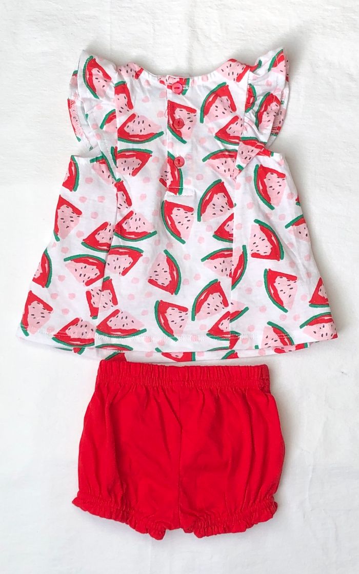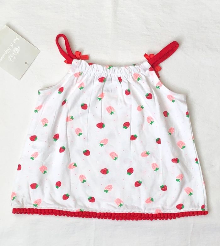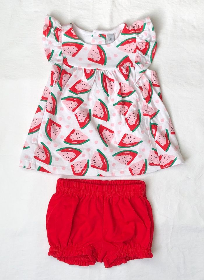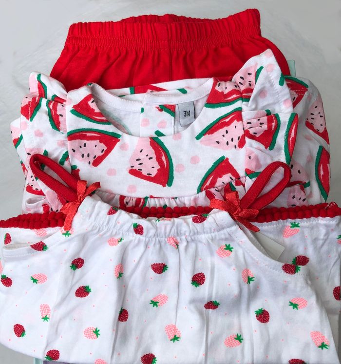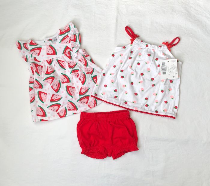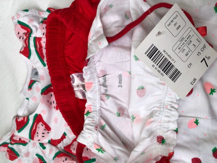 Lot 3 pièces été, soit 2 tenues possibles de diverses marques, Taille 3 mois, En coton. -top à bretelles Pat&Ripaton, Blanc motifs fraises rouges et rose pâle, petits nœuds sur les bretelles. -Ensemble Plus Collection : t-shirt/ top sans manches, blanc motifs pastèques, volants sur les épaules et short/bloomer rouge. Lot neuf : -top Pat & Ripaton avec étiquette -ensemble pastèque sans étiquette mais jamais porté. 5 🌸 Vous aimez cet article ? N’oubliez pas de visiter le reste de mon dressing en filtrant les tailles.