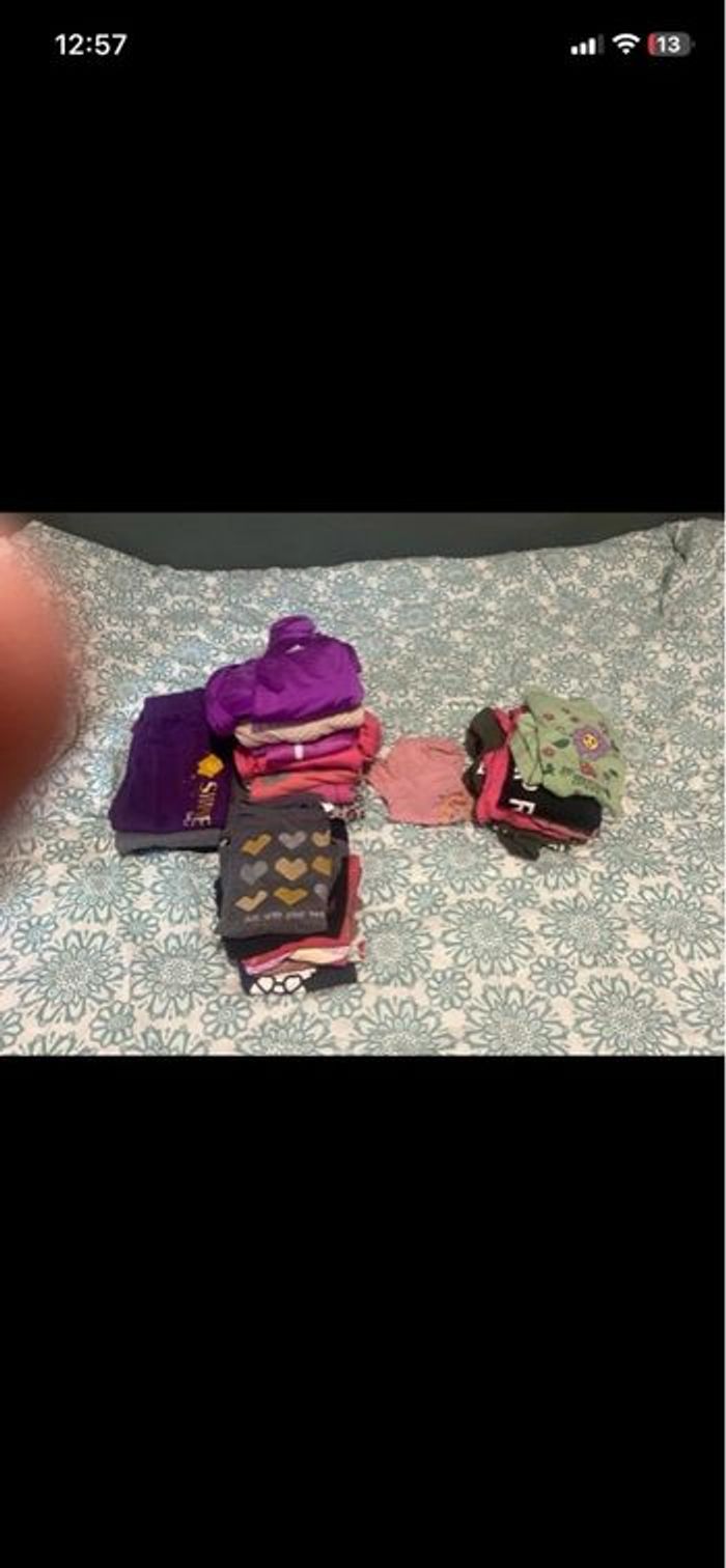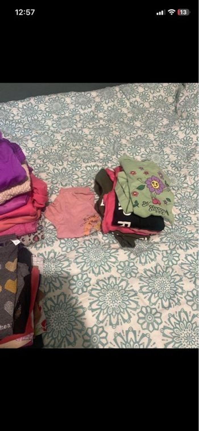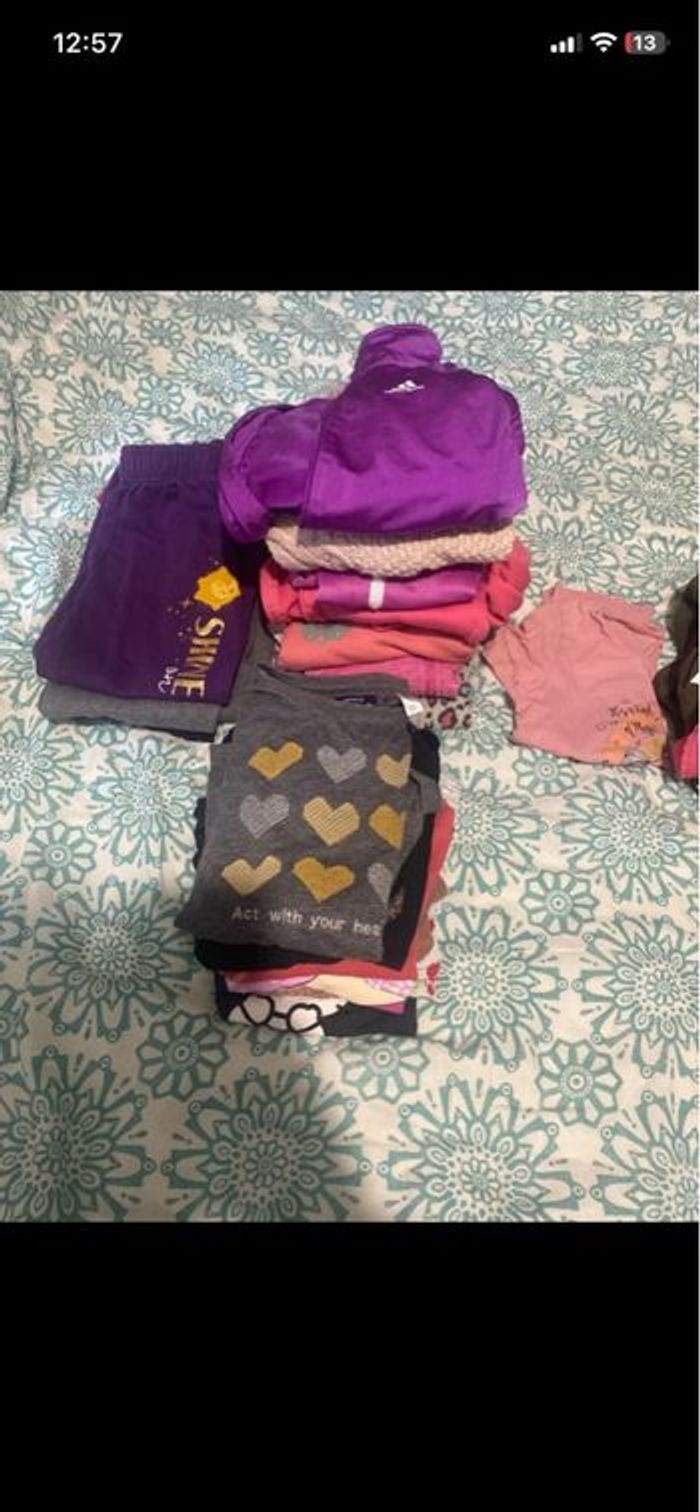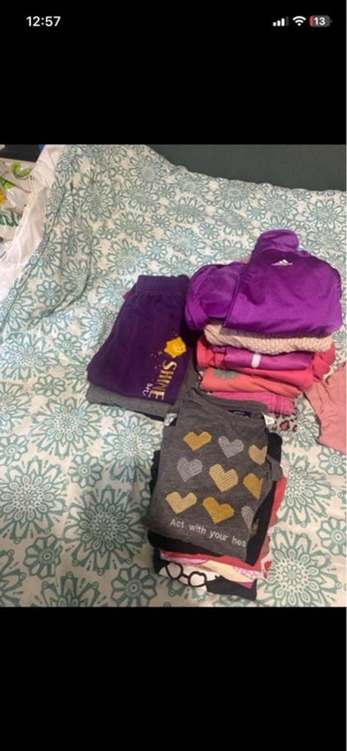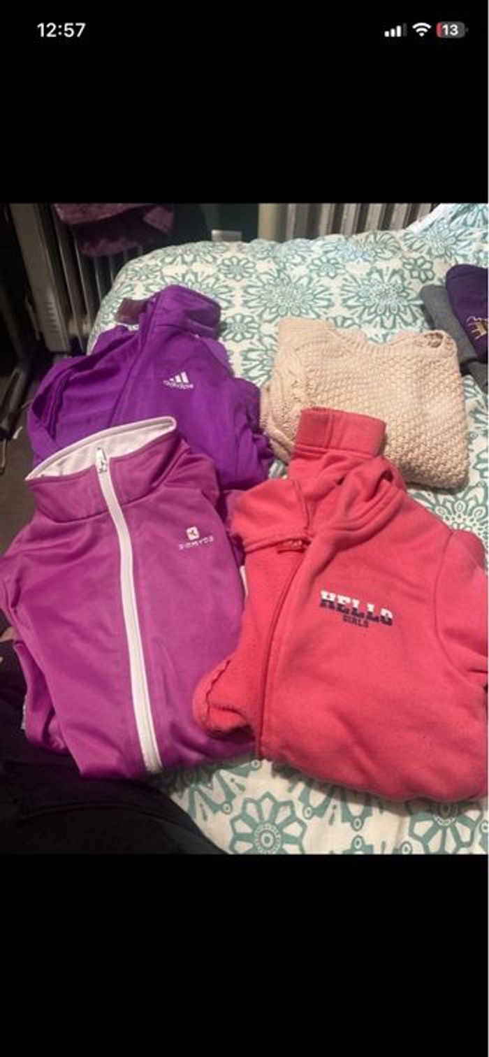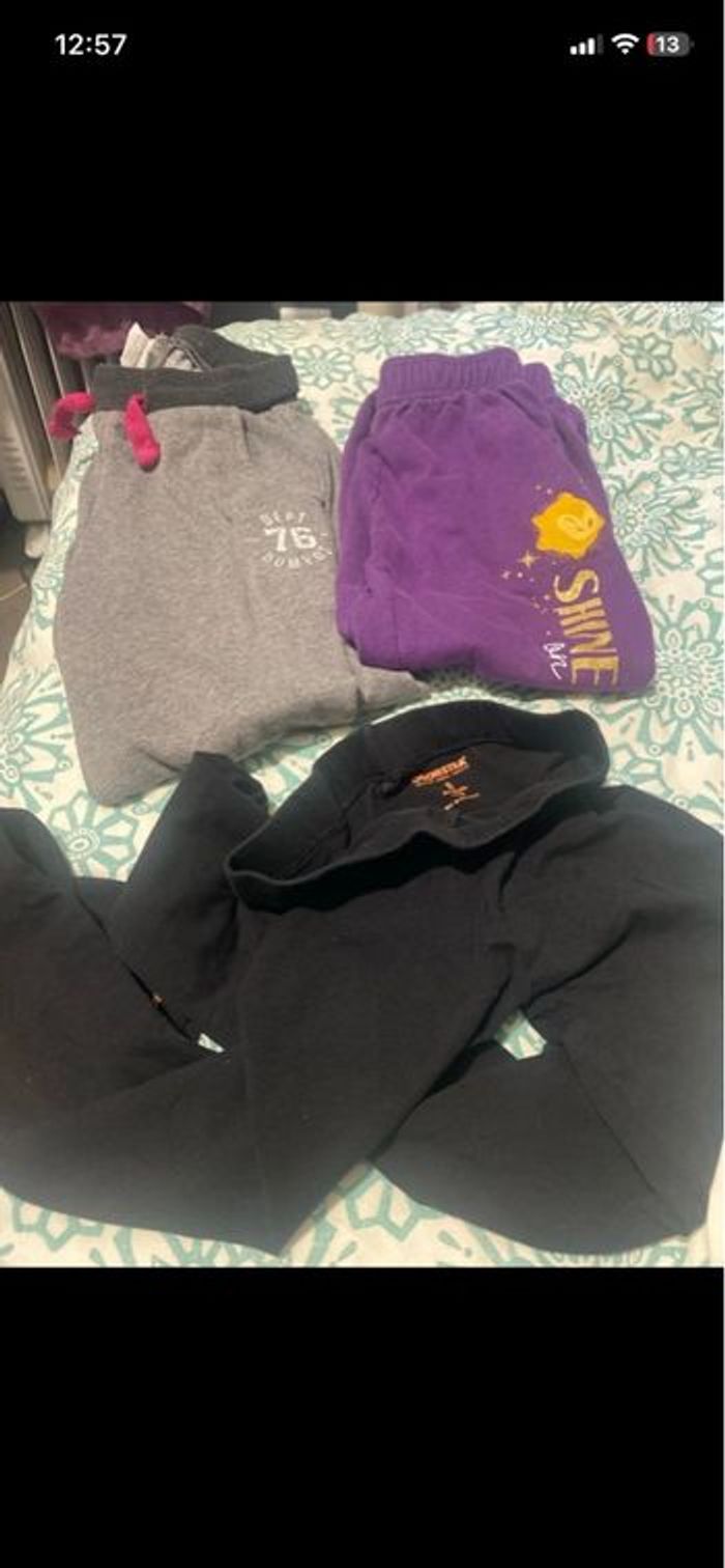 En grosse partie du 8ans 1debardeur 8hauts manche longue 1est tacher au niveau col on le voie sur la photo il et gros avec des oiseau de marque orchestra 1tee shirt 9pulls ou gilets 2joggings 2legging noir