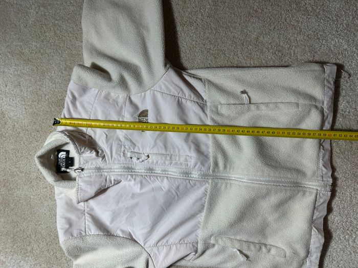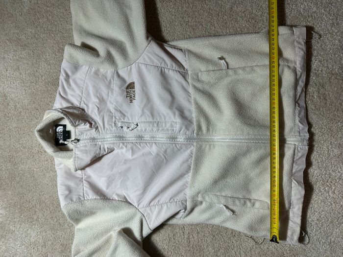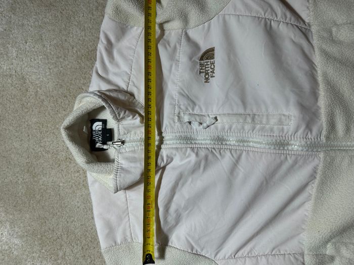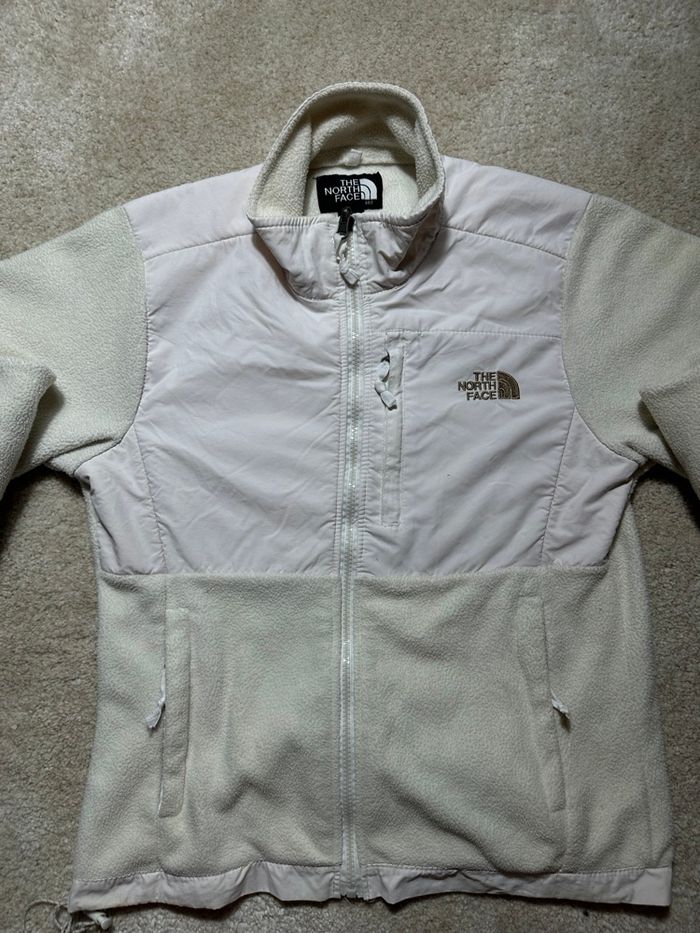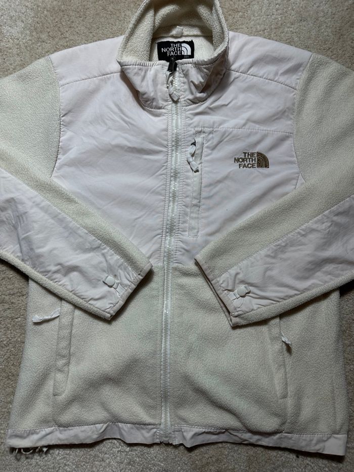 Magnifique Polaire The North Face de couleur Blanche et crème. Légère petite tache sur le devant de la veste et en bas de la veste visible sur les photos. Prix magasin :299€. C’est une taille S pour Femme Si vous avez des questions n’hésitez pas ! 😉