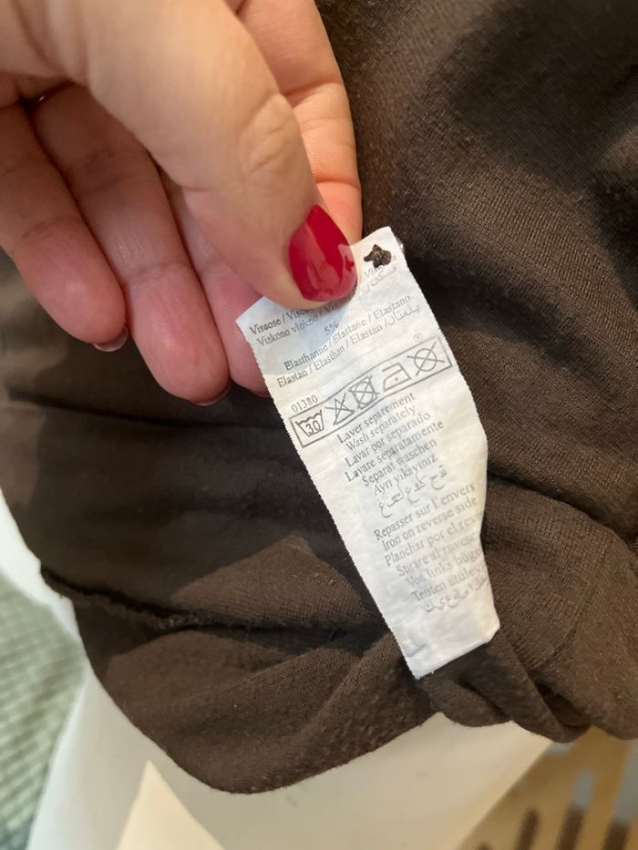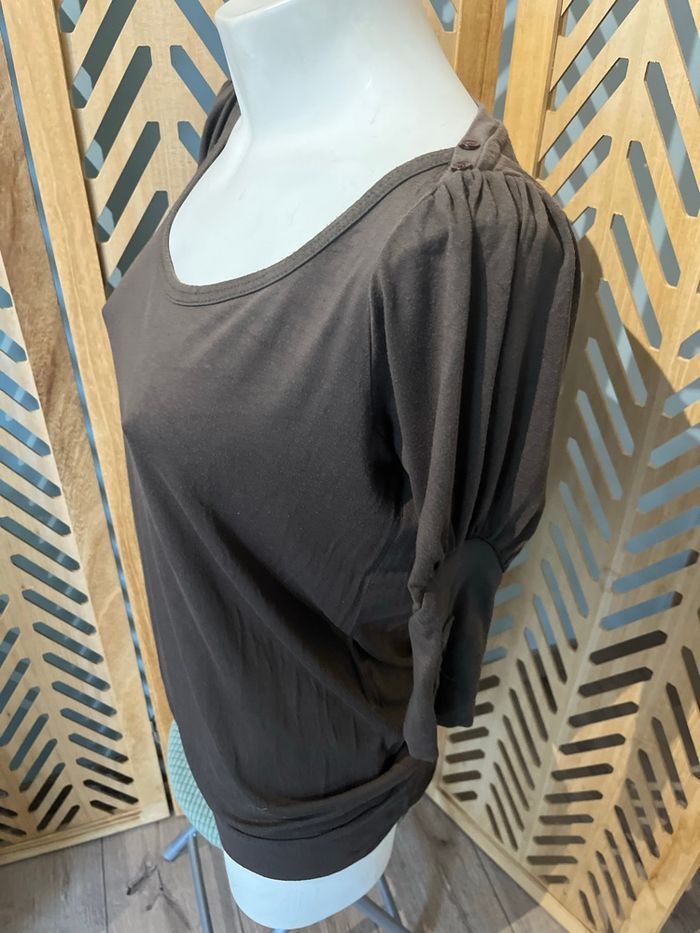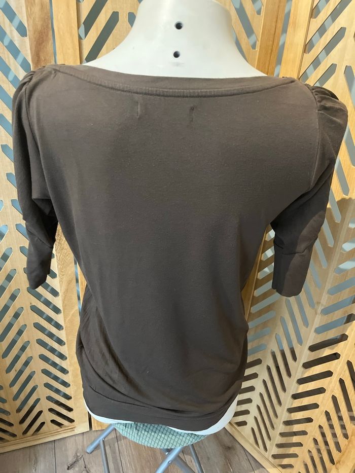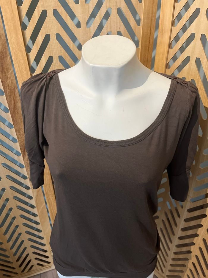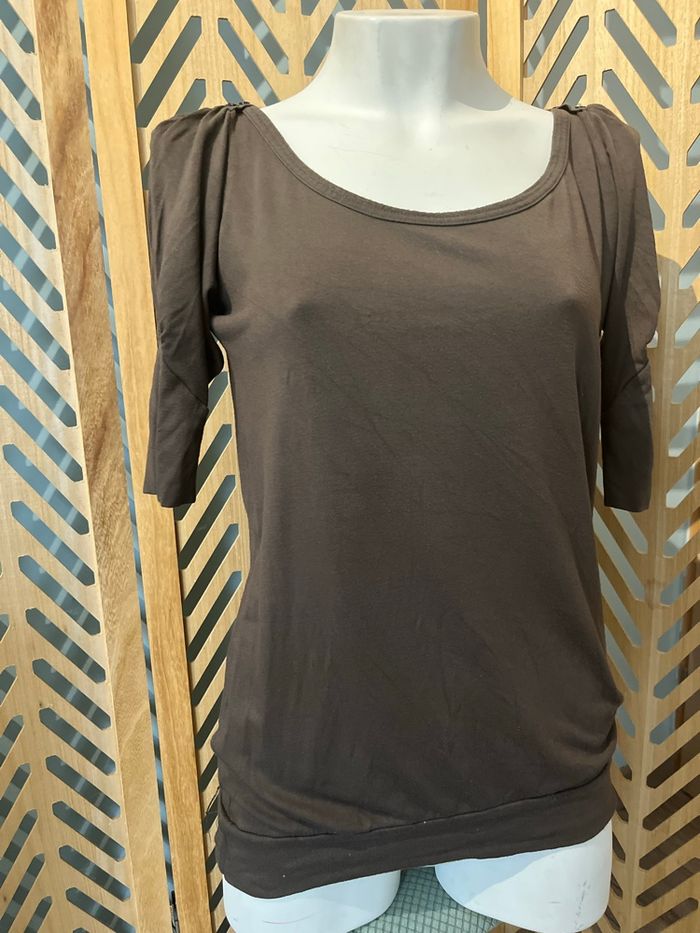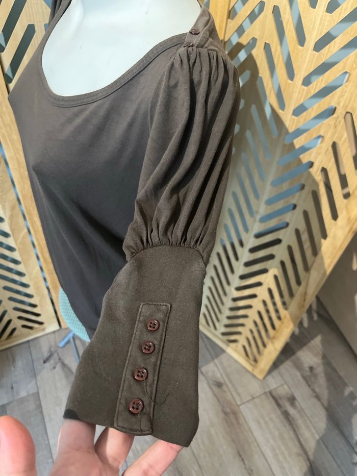 Jolie t shirt long / tunique Cache cache En taille 4 Coloris vert kaki / marron Manches courtes Coupe original qui tombe sur les hanches , belle encolure et détail boutons