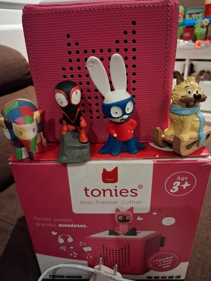 vends cette Tonies box avec 5 figurines Tonies. Le creatif, le journal de gurty, simon (oreille abîmé), miles morales et Elmer - Type de produit : Figurines - Marque : Tonies - Composition du lot : 1 Tonies box et 5 figurines Tonies - Âge recommandé : De 4 à 6 ans Très bon état. N'hésitez pas à me contacter pour plus d'informations !
