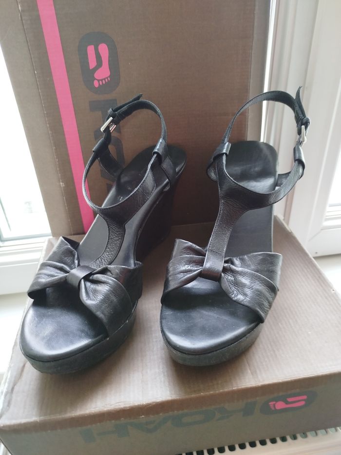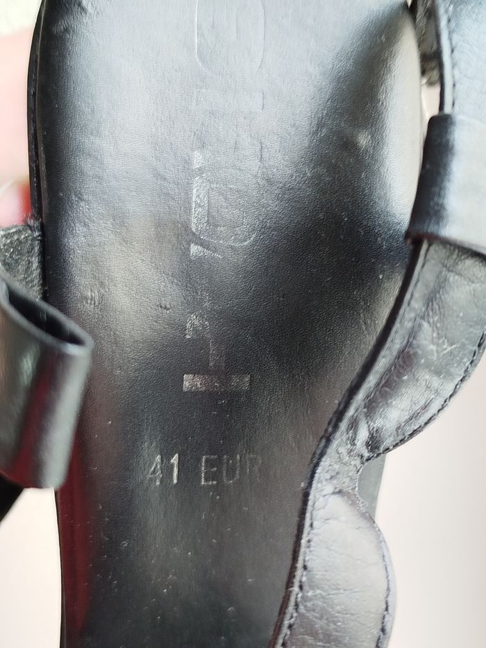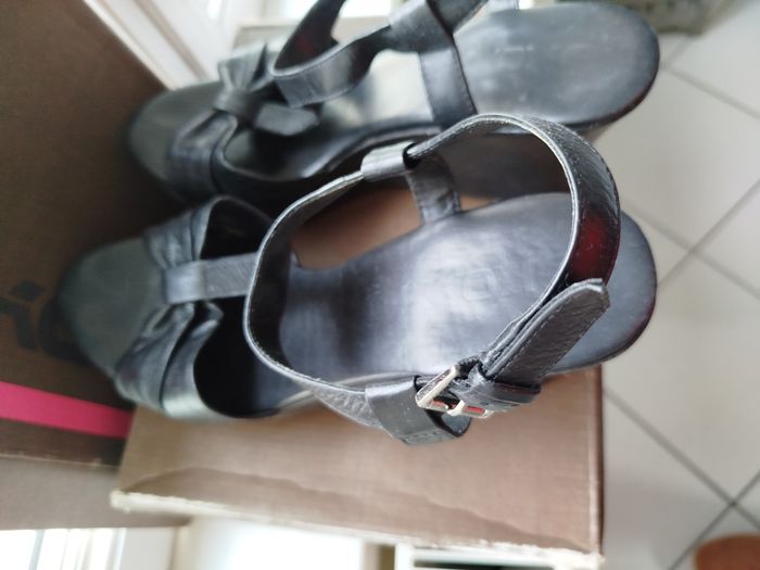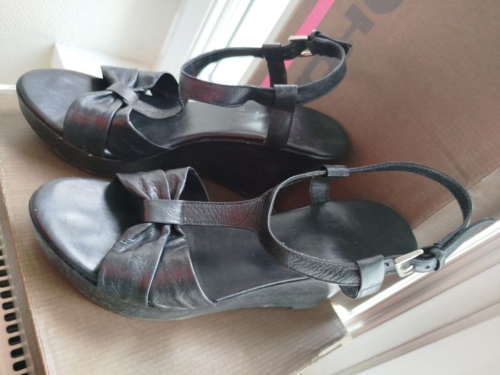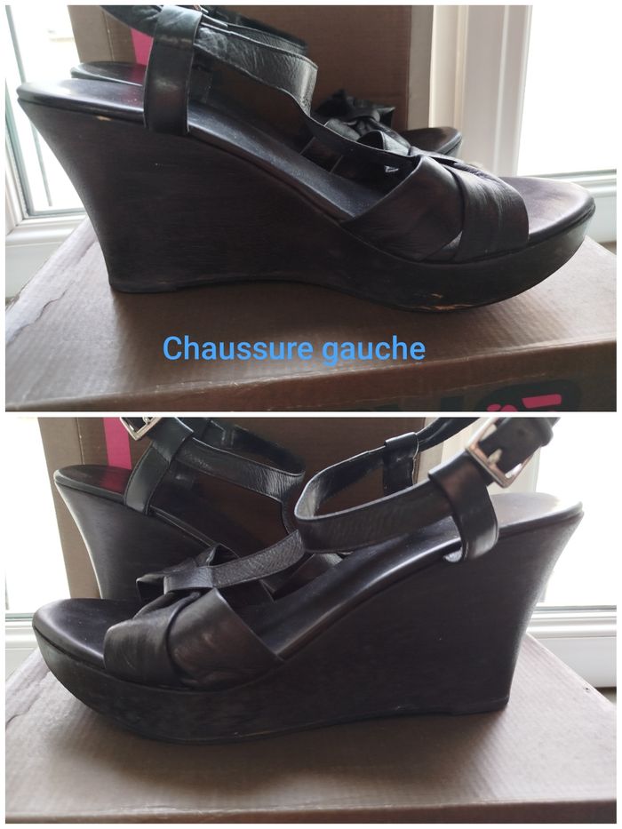 Paire de chaussures estivales de couleur noir. À talons compensés (en bois). Bois abîmé causé par la marche (sur les parties bois intérieur, coups de chaussures les une contre les autres dûs à la marche - voir photos). A part ceci, tout est ok sur les chaussures, cela n'altère en rien le confort et la marche.