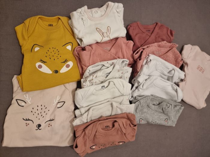 Lot de 14 bodies en très bon état dans l'ensemble, manche longue. Taille 1 mois