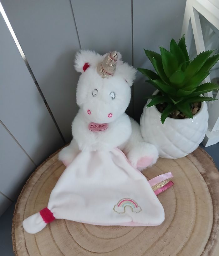 Doudou licorne baby nat avec mouchoir, collection Poupi et poussières d'étoile, jamais servi, à noter étiquette de la marque présente mais prise dans la couture (seul défaut) Réf BN0320 Non négociable