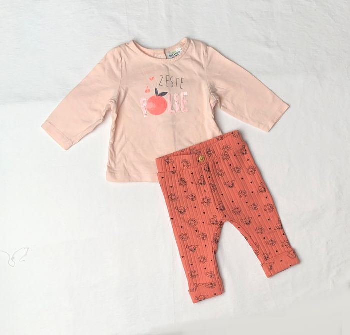 Adorable ensemble mi-saison 2 pièces, Taille 3 mois/ 59 cm. -T-shirt manches longues Tape à l’œil, Rose pâle, inscription « un zeste de folie », motif orange en sequins. 100% coton. Ouverture intégrale, par pressions, tout le long du dos. -Legging cotelé, Disney, rose/orange saumon, motifs Bambi, Pampan, Marie. Bouton décoratif effet bois à la ceinture. Revers au bas des jambes. Lot en excellent état, sans trou ni tache. Non grisé. 🌸 Vous aimez cet article ? N’oubliez pas de visiter le reste de mon dressing en filtrant les tailles.