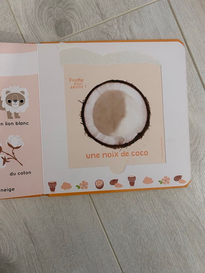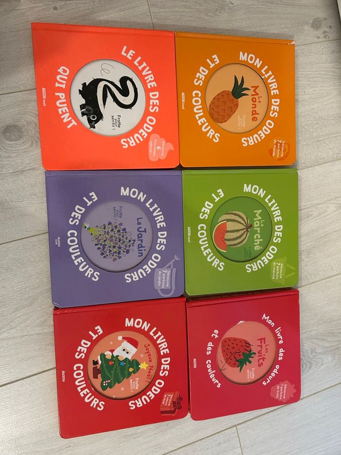 Lot de livre des odeurs, en bon état. Une page du livre des odeurs et des couleurs (orange) est abimée, l'odeur est toujours présente malgré cela.