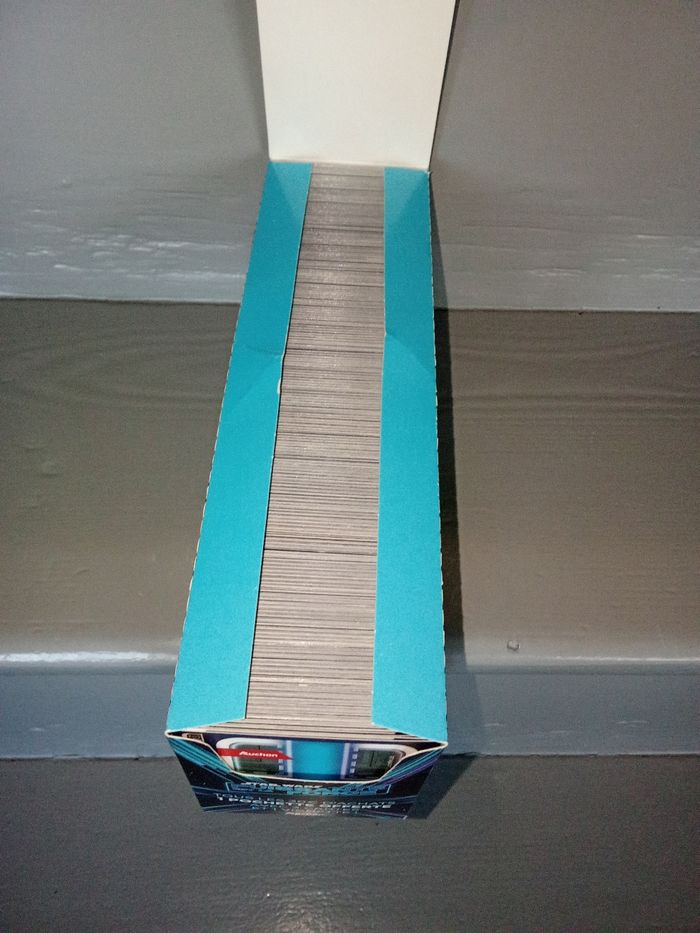La boîte est légèrement abîmée (voir photos). Elle comprend 200 paquets de 3 cartes + 1 vignette.