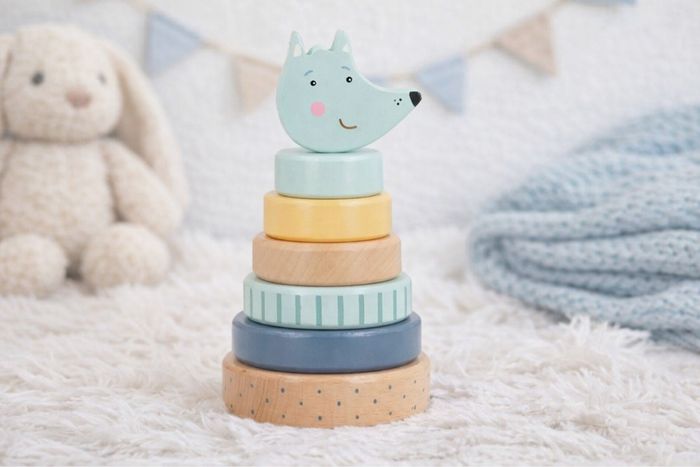 Tour empilable représentant un sympathique grand méchant loup, parfaite pour favoriser le développement de la coordination œil-main et stimuler les compétences motrices fines. Comprend: 1 base, 6 pièces empilables Matériau : bois de hêtre 100"% certifié FSC Peintures à base d'eau Dimensions 19 × 10 cm