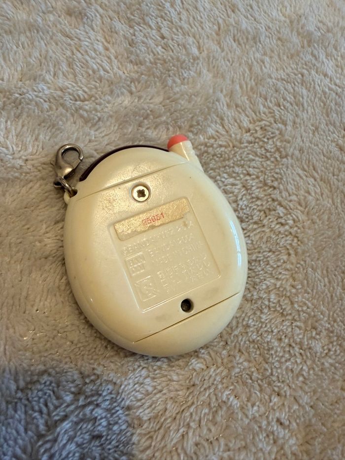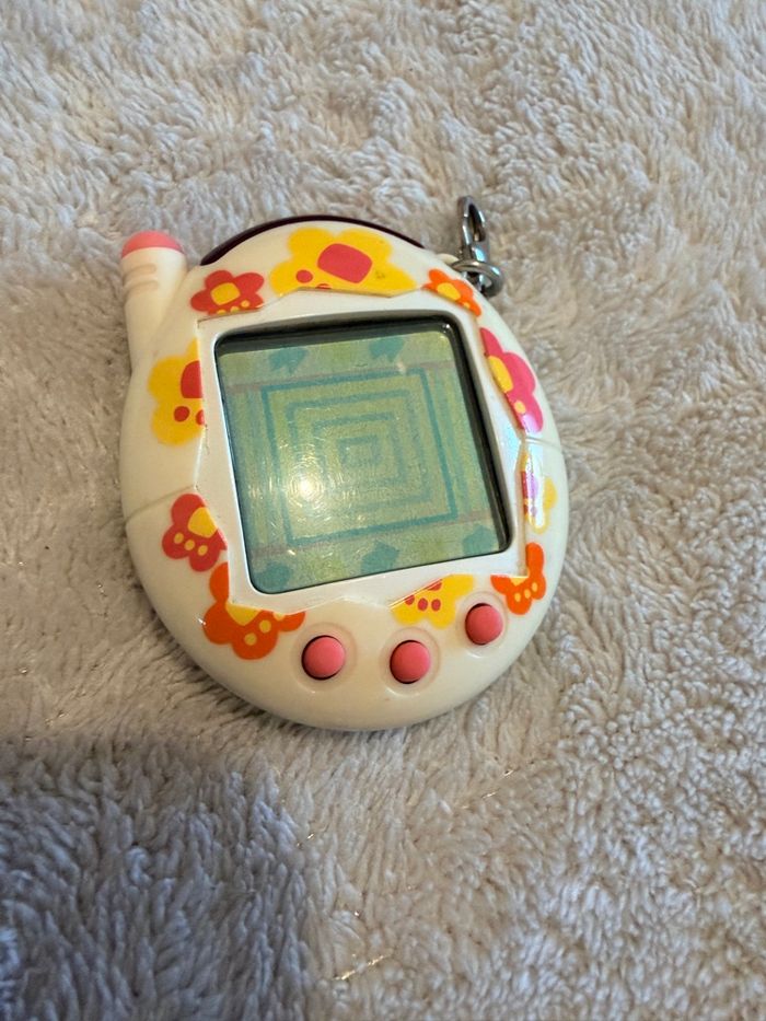 Tamagotchi Keitai Kaitsuu blanc a fleur Tamagotchi Plus White Tout est fonctionnel, son écran. Une photo sera envoyé le jour de l’envoi. Pas d’oxydation un très bel état esthétique pour son âge de 2004, juste la face arrière comporte quelques petits frottement voir photos.