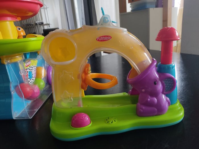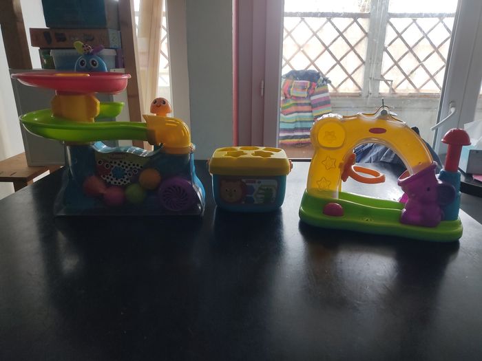 Lot de 3 jouets - deux jouets a piles (piles fournies) qui consiste a appuyer sur le bouton poussoir pour faire démarrer la partie. Les balles (4 balles pour les deux jeux) font un circuit en musique. - un jeu des formes a encastrer (complet) En bon état général, besoin de redonner un coup de chiffon.