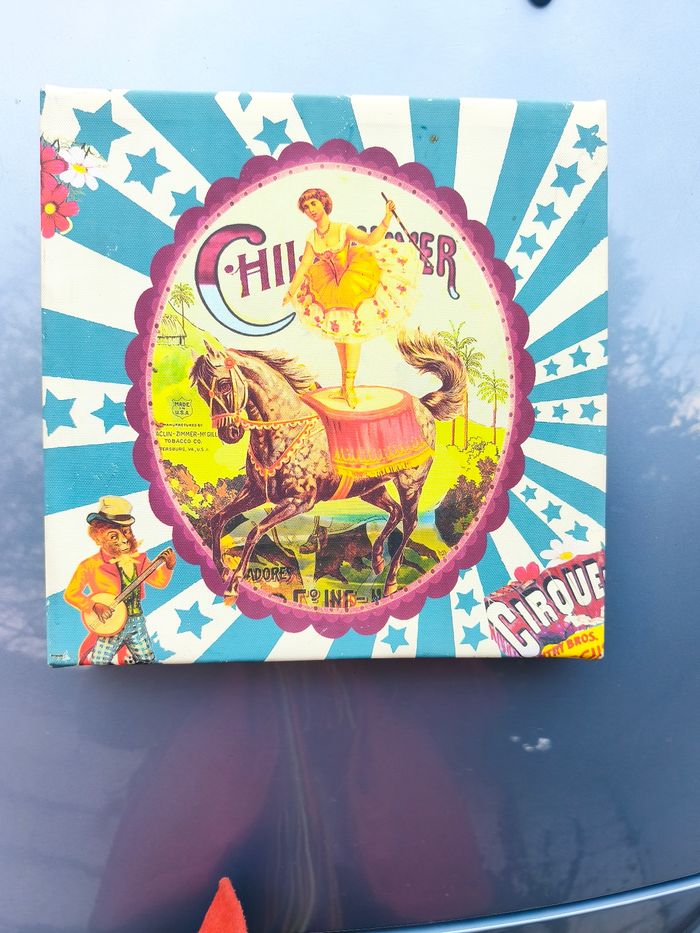 Je vends ce tableau de style cirque, avec une illustration colorée et festive d'une artiste sur un cheval. - Type de produit : Tableau - Style : Cirque / Vintage - Matière : Bois - Couleur : Multicolore - Dimensions : 30 x 30 cm Très bon état N'hésitez pas à me contacter pour plus d'informations.