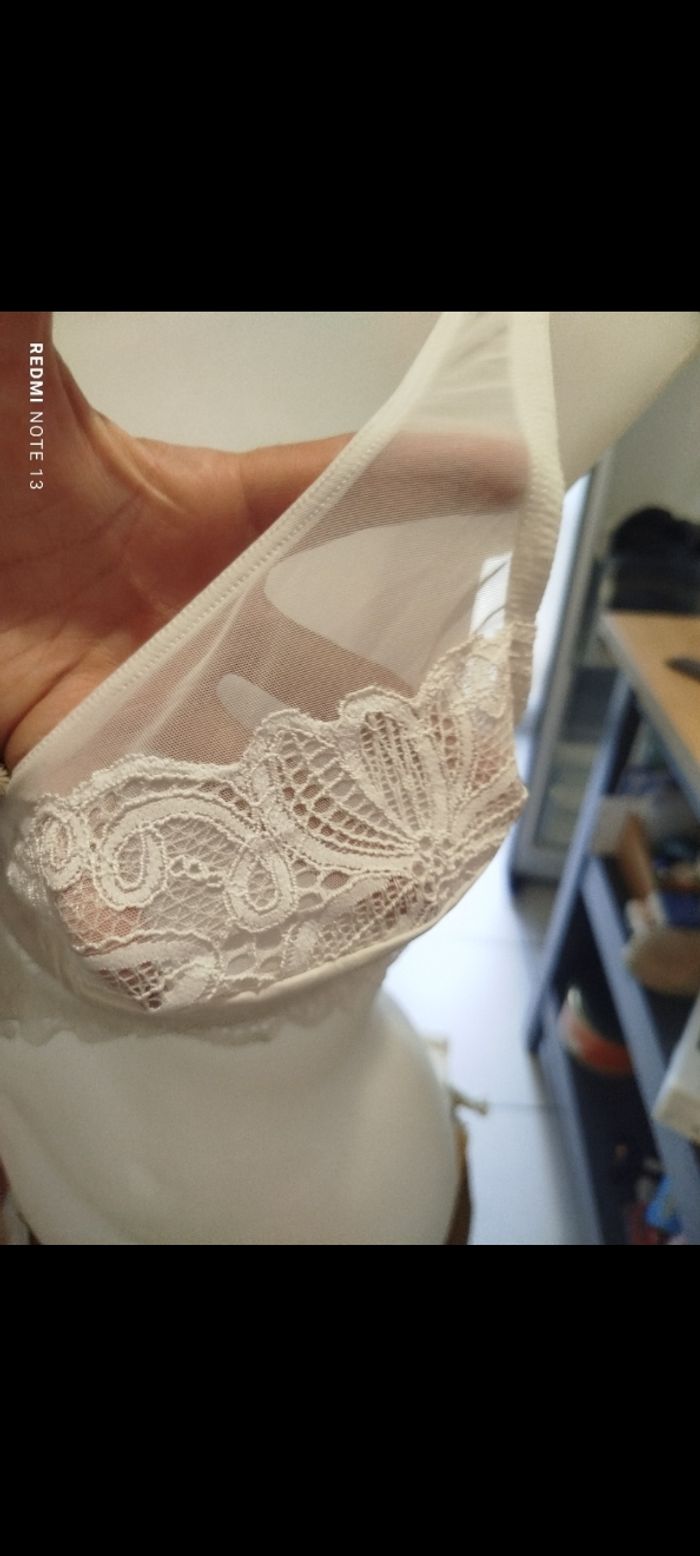 #kytie95Dfemme. Soutien gorge taille 95D de marque Well blanc armature et dentelle et tulle transparent fin satiné au niveau de la poitrine en état neuf ref 765