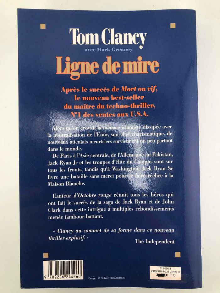 Réduction dès 2 articles achetés 5%, 3 articles 10%, 5 articles et plus 20% Me demander SVP pour que j'applique la réduction avec les frais de port au plus bas. Résumé: Alors qu'on croyait la menace islamiste dissipée avec la neutralisation de l'Emir, son chef charismatique, de nouveaux attentats meurtriers surviennent, un peu partout dans le monde. De Paris à l'Asie centrale, de l'Allemagne au Pakistan, Jack Ryan Jr et les troupes d'élite du Campus sont sur tous les fronts, tandis qu'à Washington, Jack Ryan livre une bataille sans merci pour se faire réélire à la Maison Blanche. L'auteur d'Octobre rouge réunit tous les héros qui ont fait le succès de la saga de Jack Ryan et de John Clark dans cette intrigue à multiples rebondissements menée tambour battant.