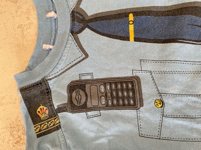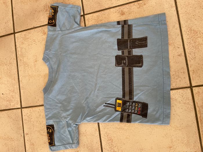 Teeshirt à manches courtes de police. Je le considérai comme un déguisement mais ça peut être un tee-shirt normal vu qu'il est en coton (et non pas en "synthétique" comme la plupart des déguisements) Beaucoup porté par mon fils, légèrement clairci par les lavages mais encore ok pour un prochain tour. Plus d'étiquette de taille mais correspond à un 5ans (mon fils l'a encore mis un peu à 6ans mais il devenait trop petit)