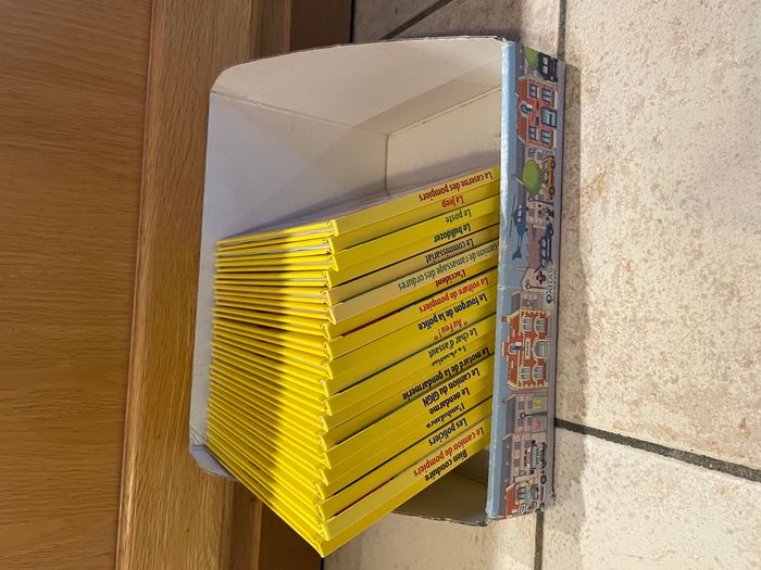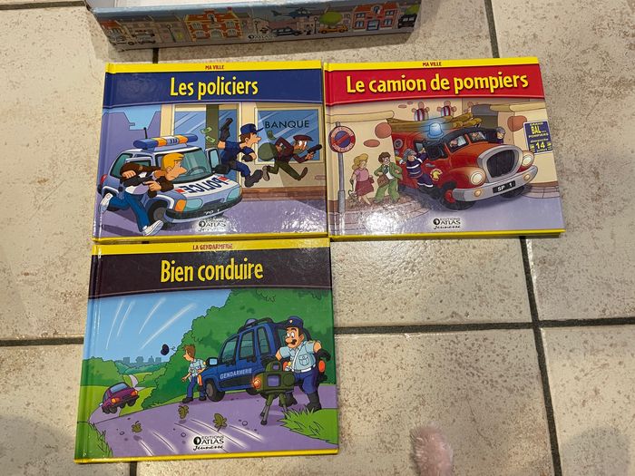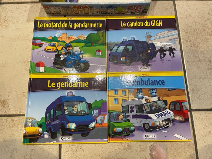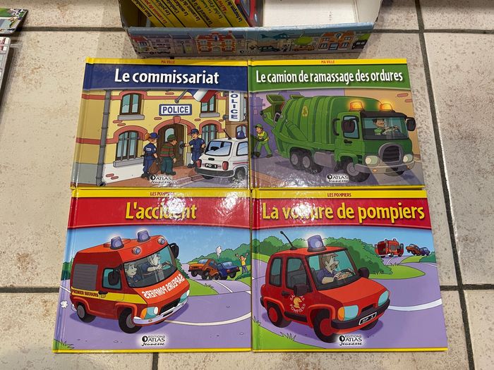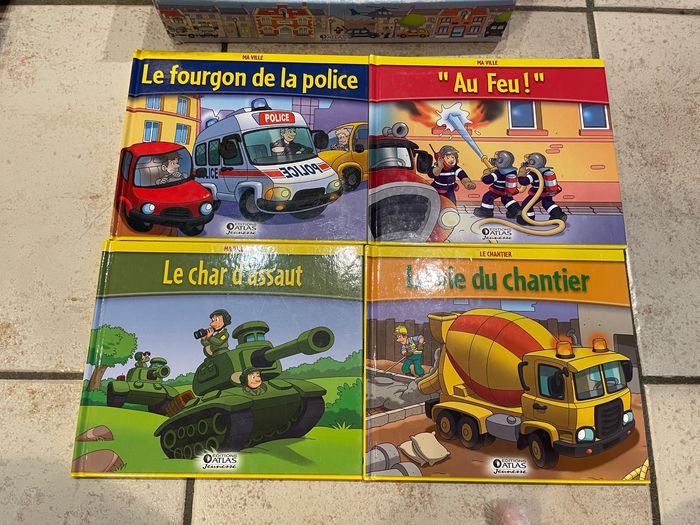 Collection de 19 livres de la série "Ma Ville" des éditions Atlas Livres que mon fils a adoré! Tous les titres sont en photo: La caserne des pompiers La Jeep La poste Le bulldozer Le commissariat Le camion de ramassage des ordures L'accident La voiture de pompiers Le fourgon de la police Au Feu Le char d'assaut La vie du chantier Le motard de la gendarmerie Le camion du GIGN Le gendarme L'ambulance Les policiers Le camion de pompiers Bien conduire Je vend la collection entière (je ne les sépare pas). Je les ai tous vérifié un par un, ils sont en bon état (voire très bon état), un ou deux ont des petites traces d'utilisation discrètes (voir les 2 dernières photos)