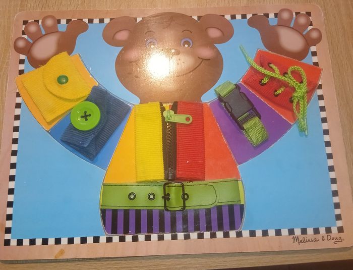 Jolie planche d’activités : puzzle et fermetures lacet,bouton... Cette planche a été bien utilisée et marqué quelques défauts mais reste tout de même en très bon état 🌸