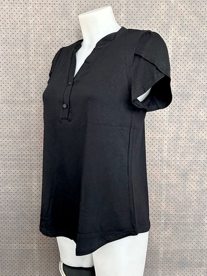Superbe haut à manches courtes dans une belle teinte noir profonde, au tissu doux et fluide. Son col fendu à deux boutons apporte une touche élégante tout en restant confortable pour le quotidien. Un basique revisité parfait pour le bureau, une sortie ou une tenue casual chic ¿) Détails : • Couleur : noir • Col fendu à boutons • Manches courtes • Coupe droite et fluide • Taille : M • État: neuf sans étiquette • Mesures à plat : • Poitrine : 49cm • Longueur totale (prise depuis le col au dos jusqu'en bas) : 63cm •Mesures indicatives, une légère variation est possible. Ă Découvre tous mes vêtements de la même taille juste ici : #laurentp74130tailleM