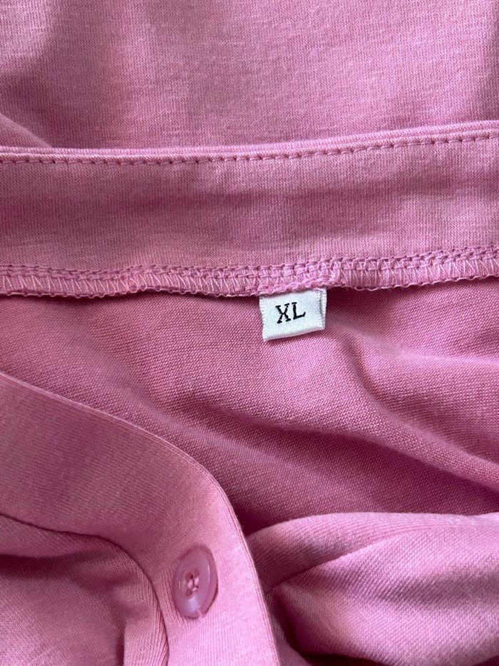 Joli haut rose clair à manches courtes, avec une encolure en V et patte boutonnée pour une touche féminine et élégante. Sa matière douce et fluide le rend très agréable à porter. Une coupe ample qui tombe joliment, idéale pour un look casual chic o Détails : • Couleur : rose clair • Encolure en V avec 2 boutons • Manches courtes à effet superposé • Coupe fluide et confortable • Taille : XL • État : excellent % Mesures à plat : • Poitrine : 55cm • Longueur totale (prise depuis le col au dos jusqu'en bas) : 66cm Mesures indicatives, une légère variation est possible.