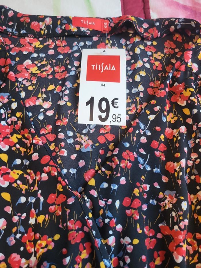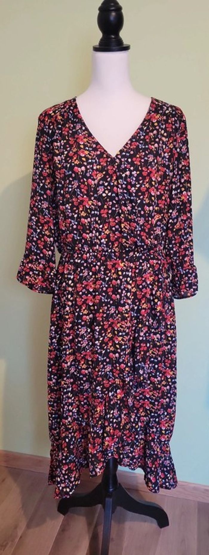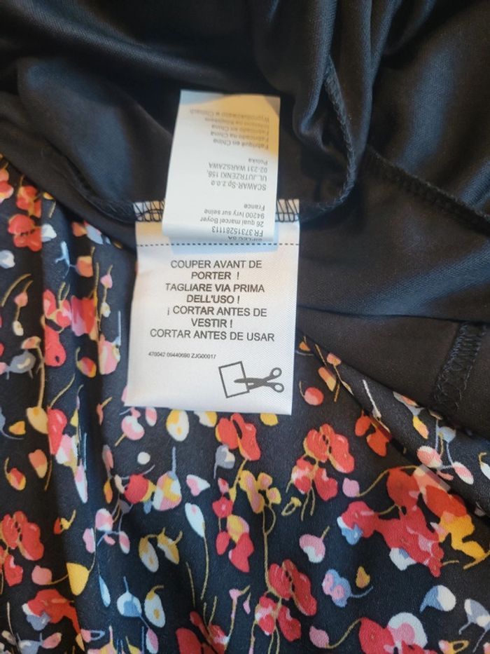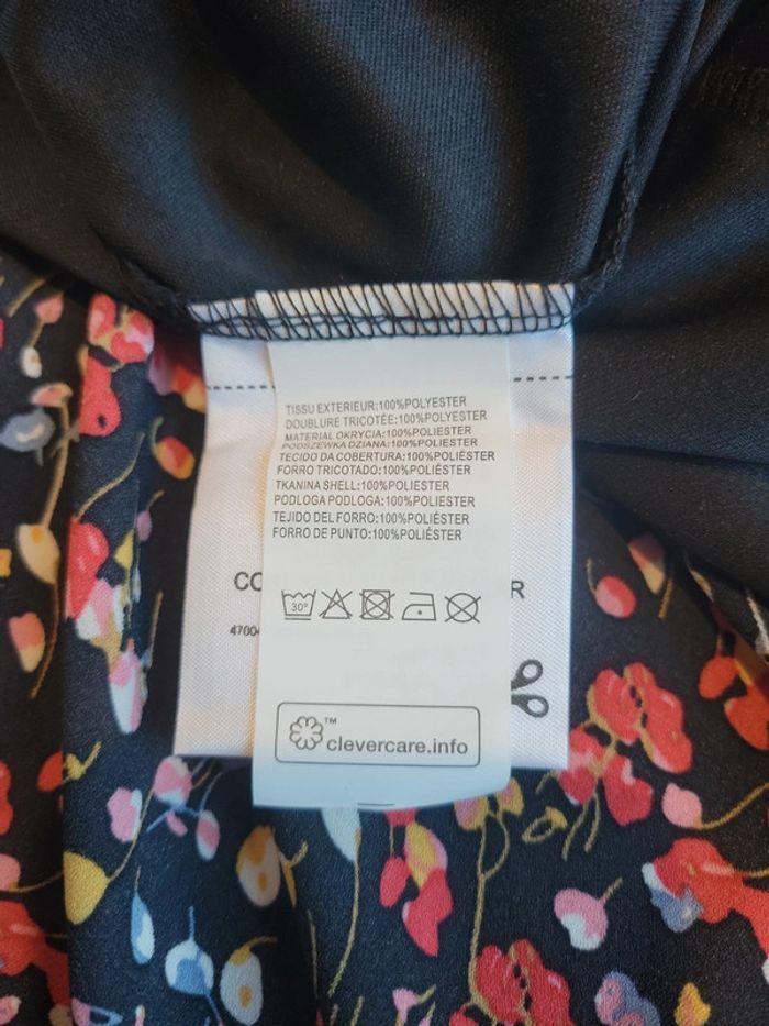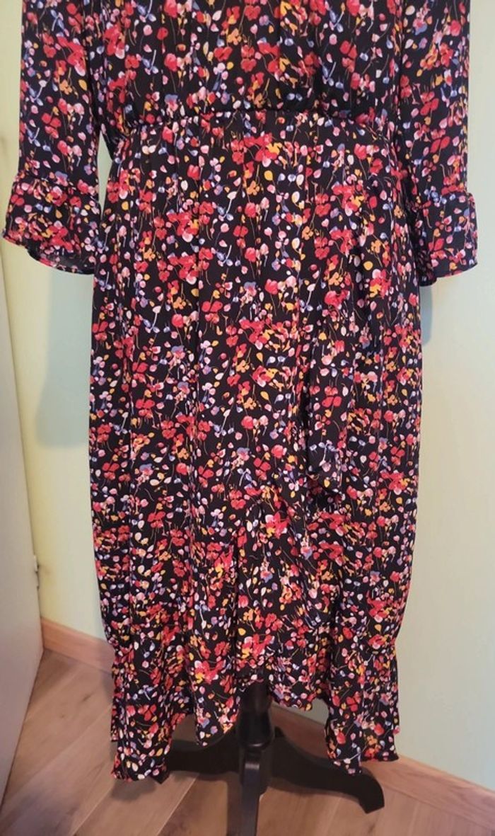 Très jolie robe fleurie, encolure V fermé par un petit bouton pression, taille élastique, volant sur l'avant et les manches.