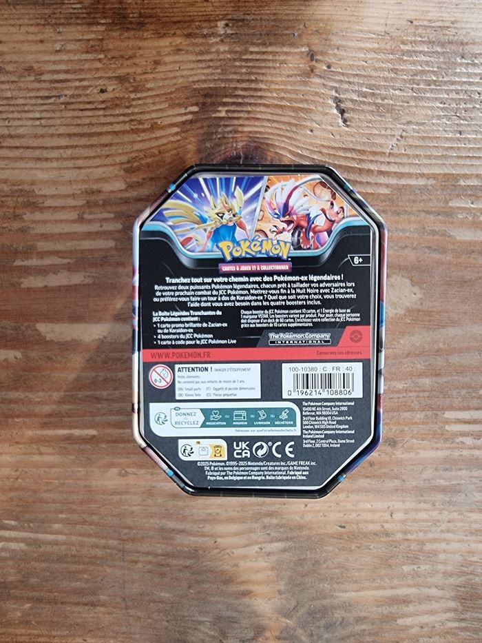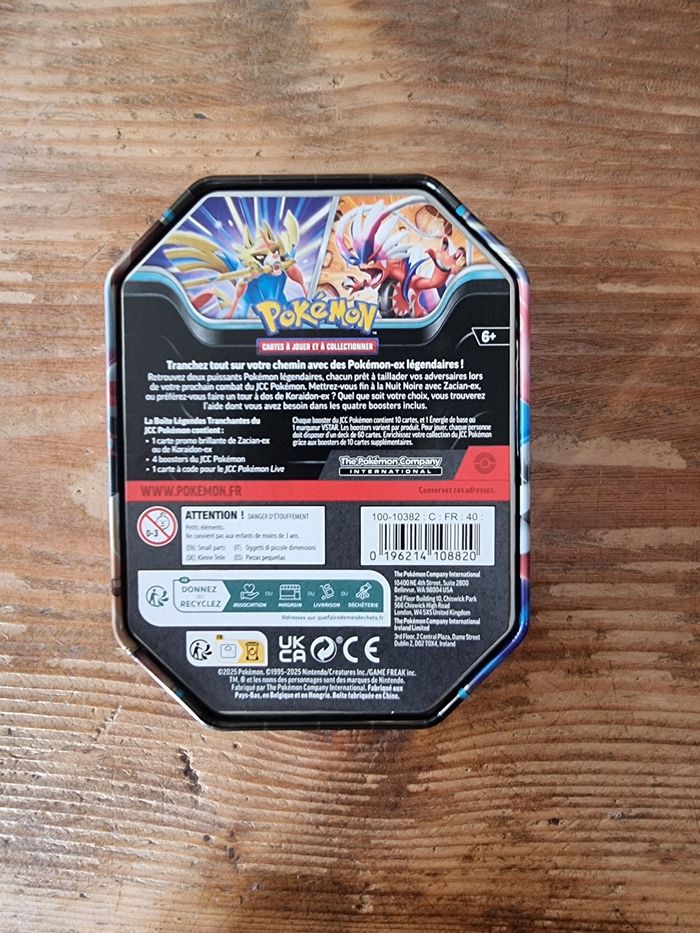 Bonjour, Je mets en vente les 2 pokebox lames tranchantes à l'effigie de Zacian EX et Koraidon EX. Parfait pour ranger des cartes ou des boosters. Si questions ou lot, n'hésitez pas à me dm