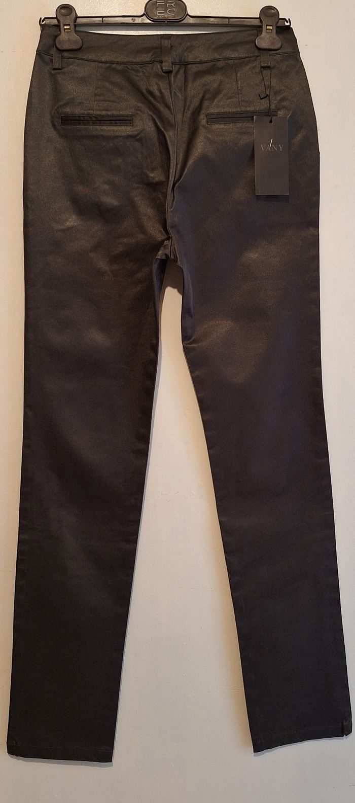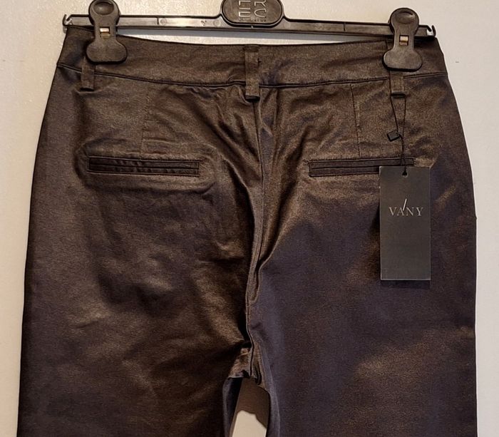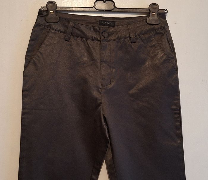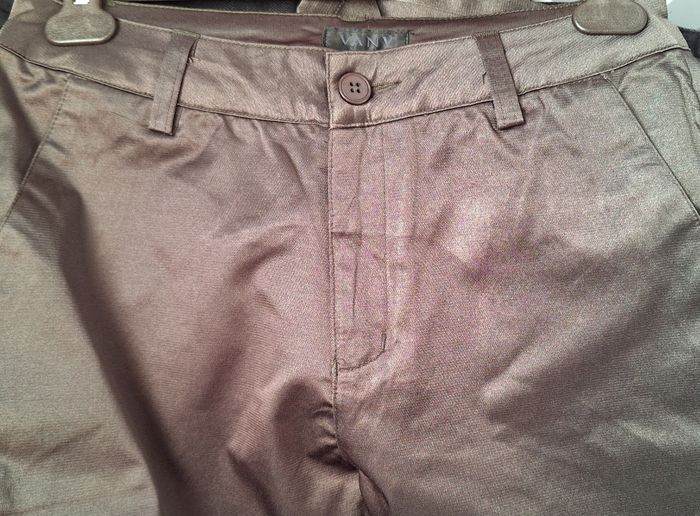 Pantalon coupe droite de couleur kaki brillant. Fermé par bouton et zip. Passants pour ceinture. Poches devant. Fausses poches derrière. En coton, nylon et élasthanne.