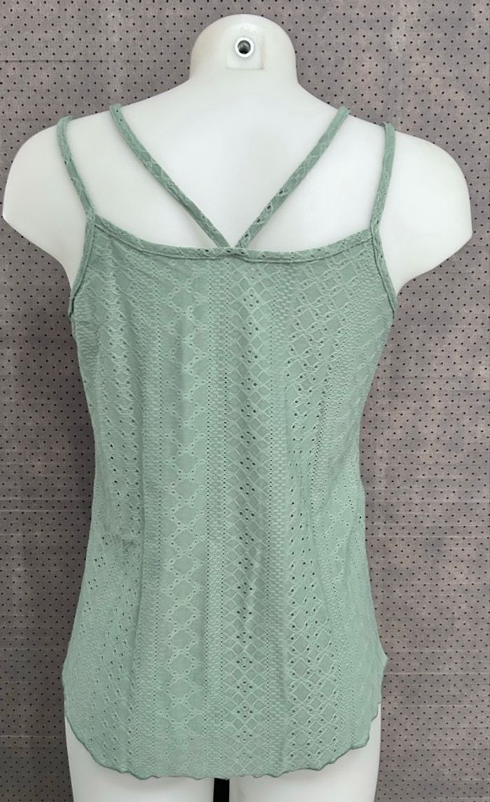 Magnifique débardeur en dentelle ajourée couleur vert pastel (vert d'eau / menthe très clair), parfait pour l'été ou en superposition ! • Bretelles fines devant + joli détail croisé dans le dos • Coupe évasée qui tombe super bien • Matière douce et légèrement extensible • Taille : S Idéal avec un jean, une jupe ou même en maillot de bain par-dessus pour la plage/plage ! • Mesures à plat : • Poitrine : 42cm • Longueur totale (dos — du col au bas) : 49cm • Mesures faites à la main, une légère variation de 1-2 cm est possible. Réductions sur les lots disponible.