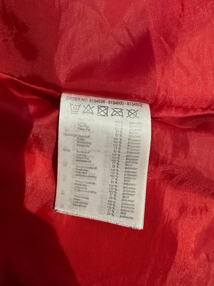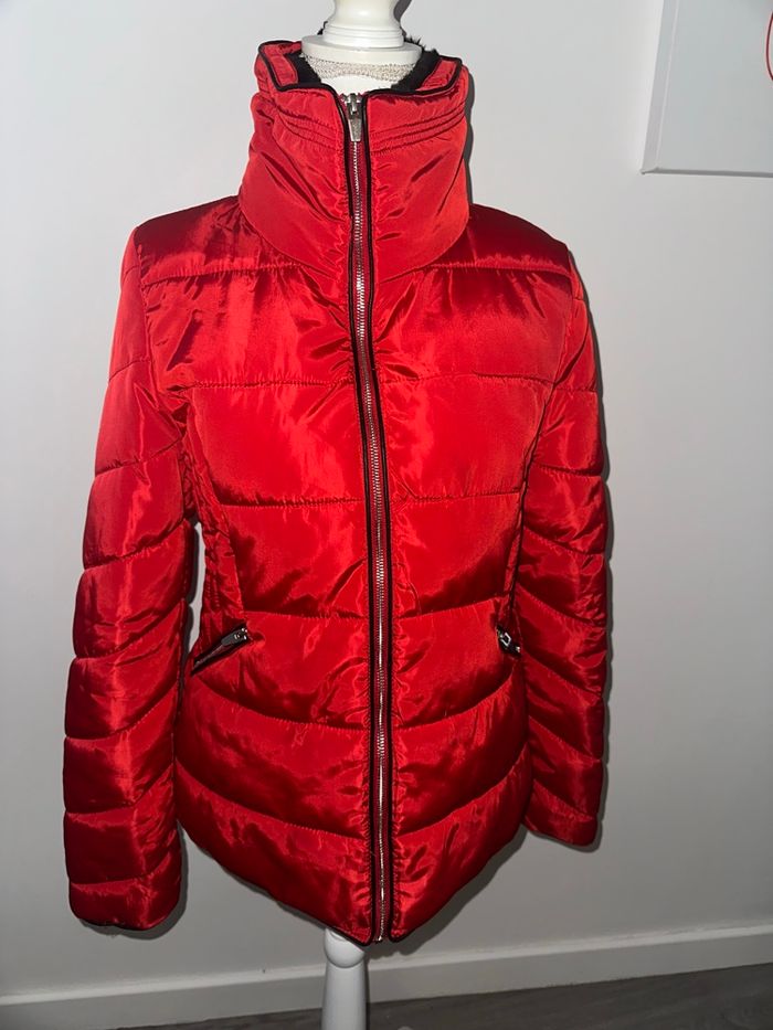 Doudoune - Veste matelassée - Excellent état - Taille 38 équivalent M Dimensions en bas de l’annonce - Rouge et noire - Se ferme avec un zip argenté - Deux poches zippées - Liseré noir en similicuir légèrement frotté par endroit (voir photos) - Légère et chaude - Fausse fourrure noire au niveau du col - Polyester, acrylique, fausse fourrure Dimensions: - 42cm niveau épaules - 50cm niveau aisselles - 64cm de long