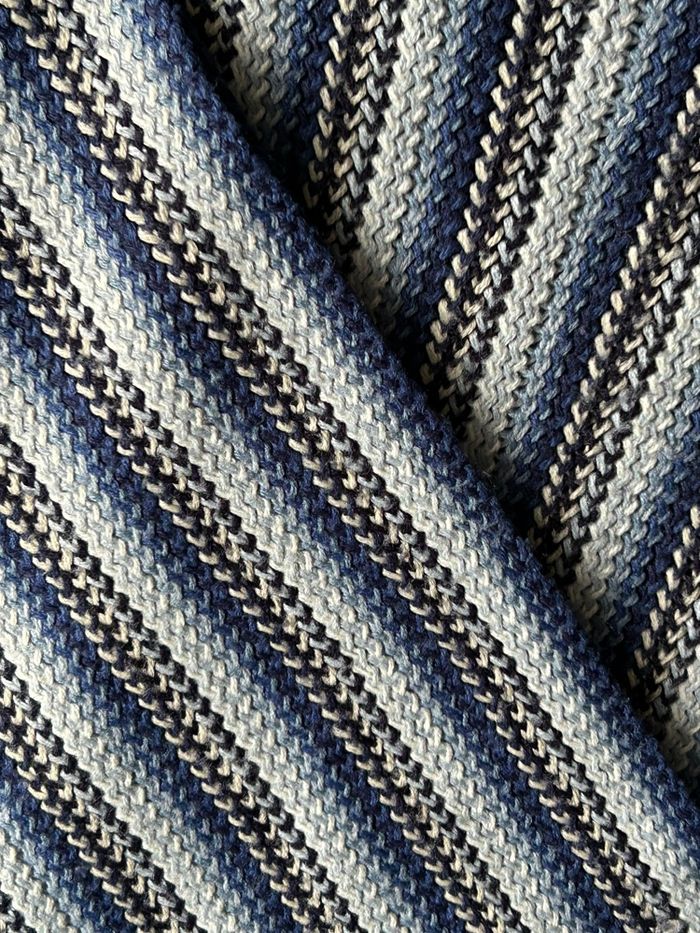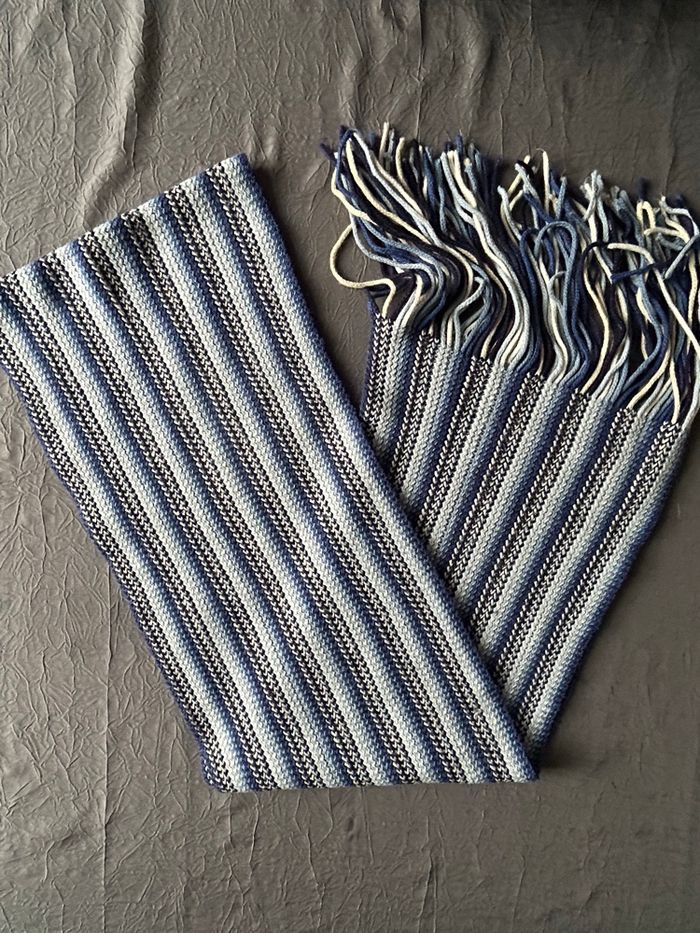 écharpe longue avec franges, dans les tons de bleu. Couleurs bleu foncé et clair, noir, blanc. Matière tricot. Longueur 160 cm. En très bon